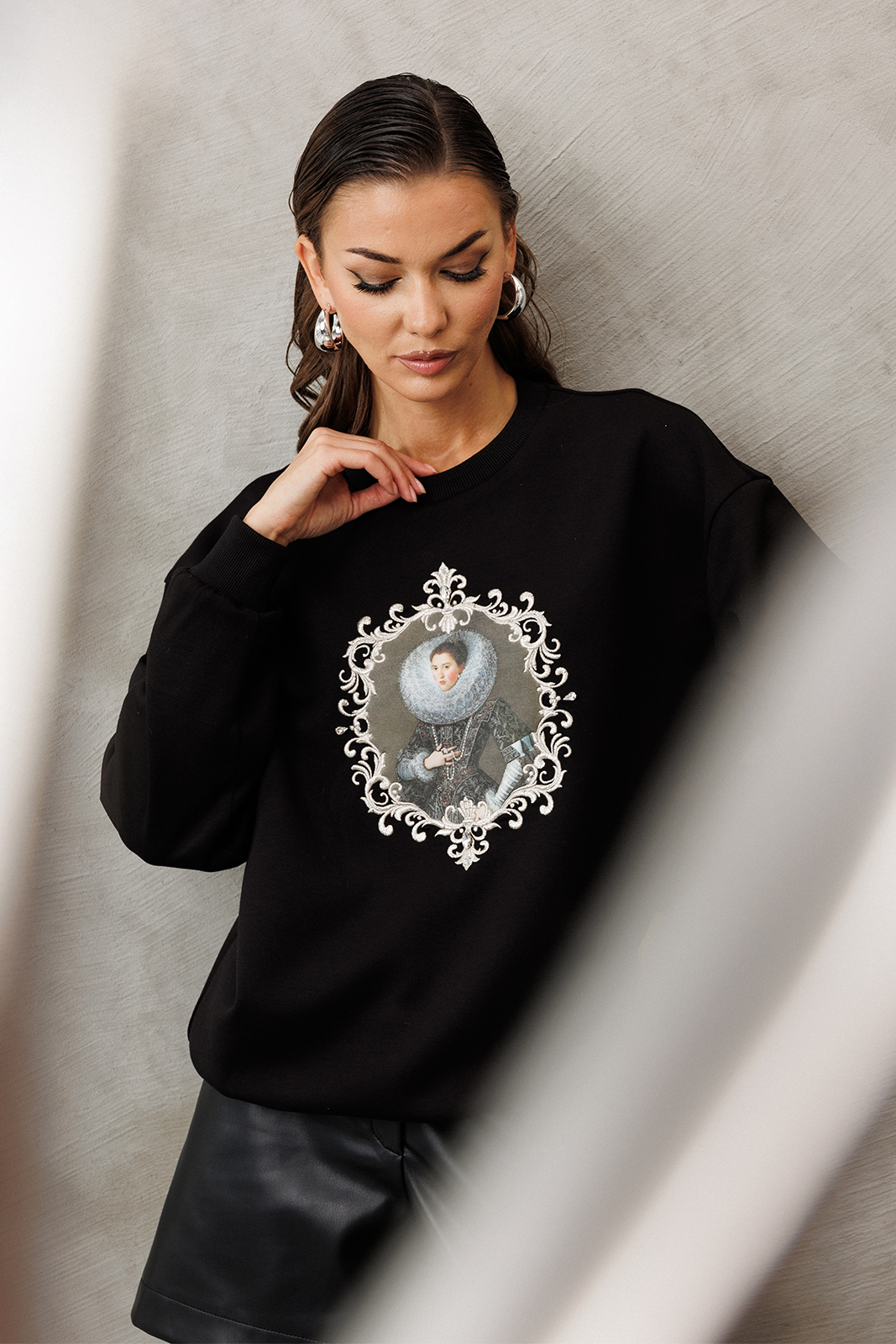 Джемпер из технологичного трикотажного полотна с эффектом peach. Прямого силуэта с втачным рукавом и спущенной линией плеча, с манжетой из отделочной ткани по низу рукава. По переду печать с вышивкой "Queen". По горловине и низу изделия притачная планка из отделочной ткани. 54% ПЭ, 40% вискоза, 6% спандэкс