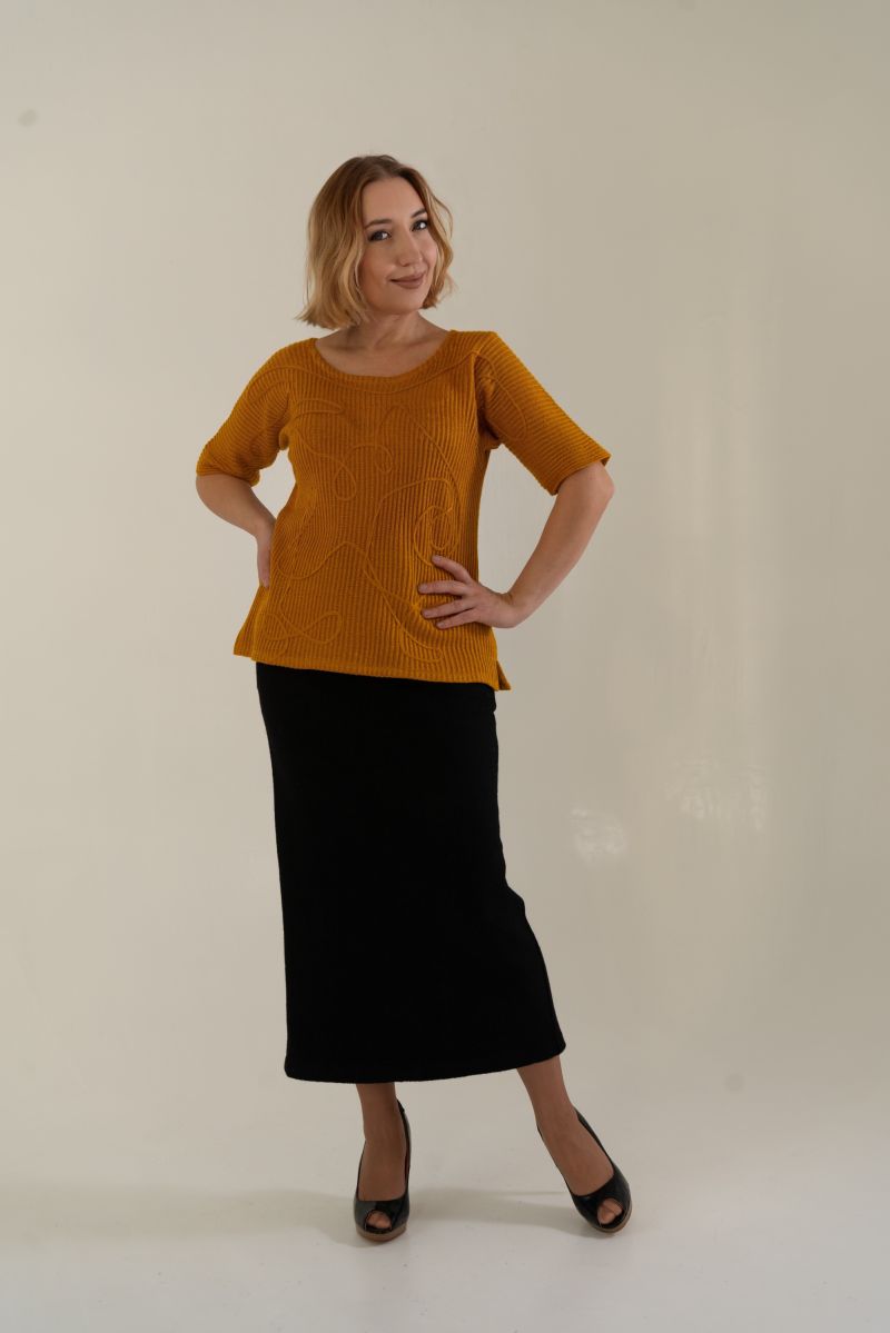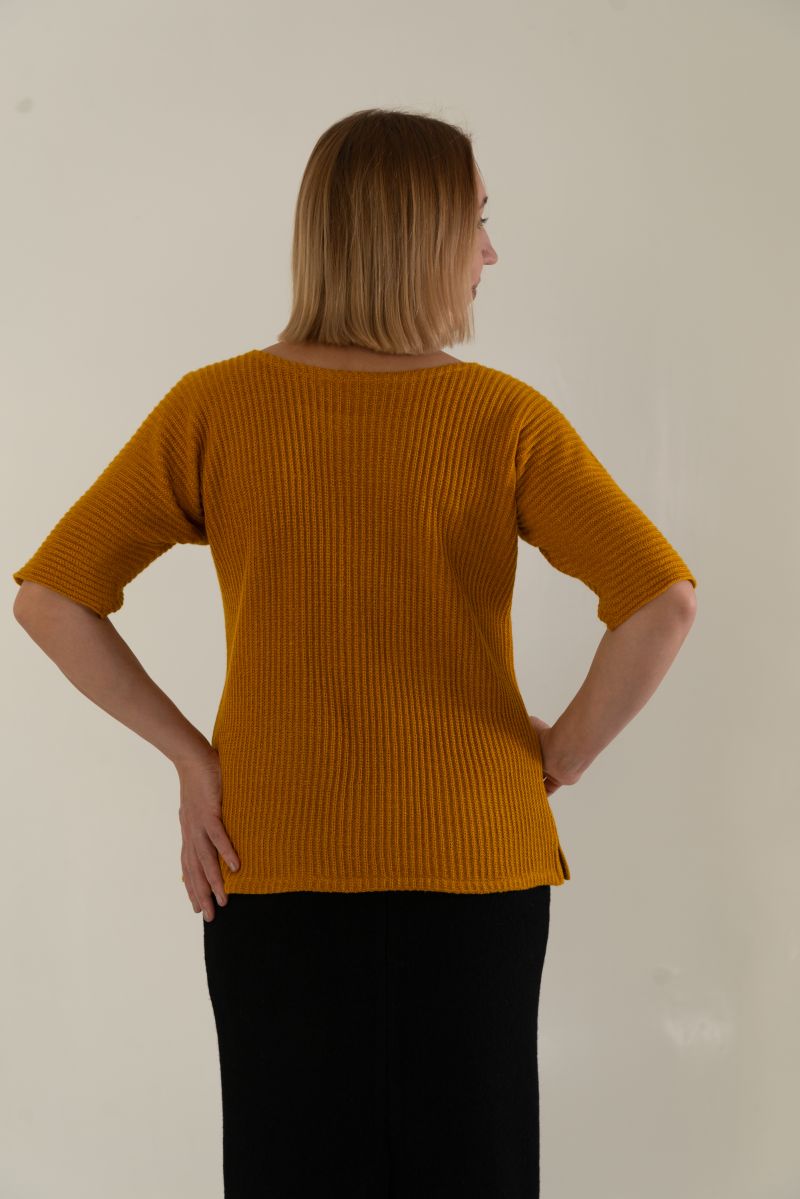 Описание: Джемпер с рукавом длиной 3/4, линия плеча спущена, по бокам разрезы, отделка, трикотаж