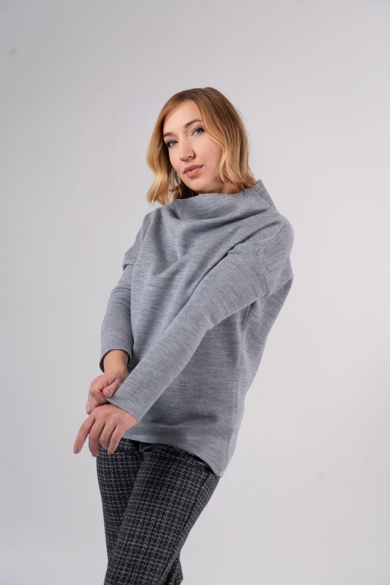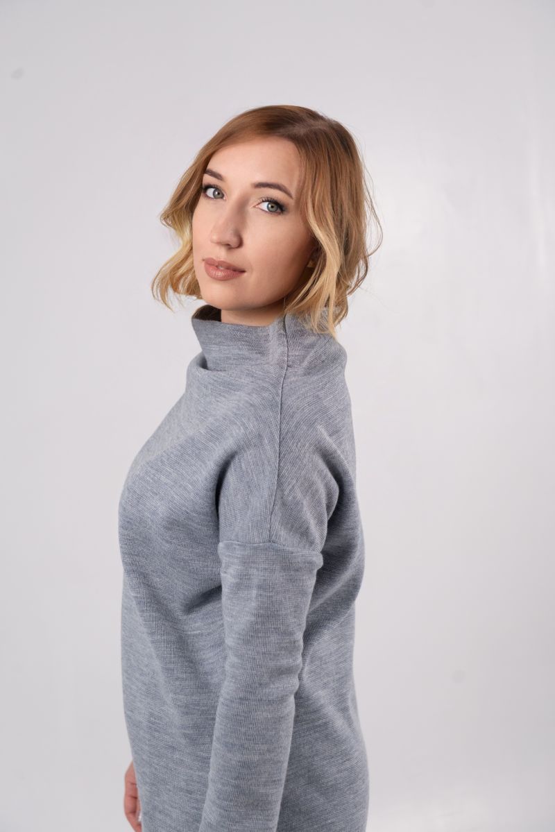 Описание: Джемпер с высоким воротником стойка, неровный низ, трикотаж,