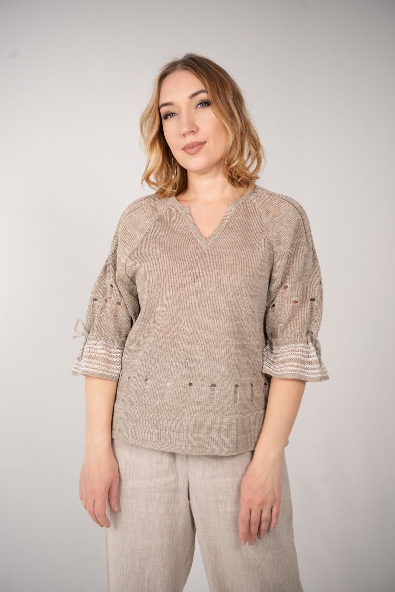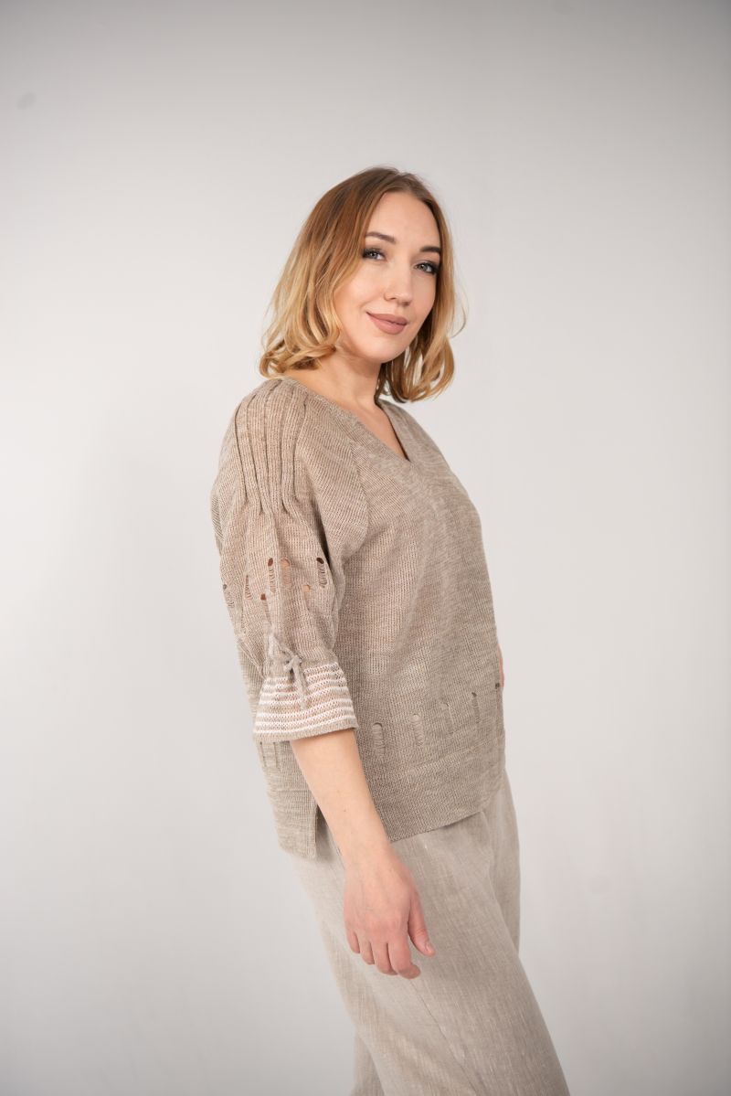 Описание: Джемпер с разрезами по бокам, фигурная форма горловины, рукав реглан на сборке, трикотаж.