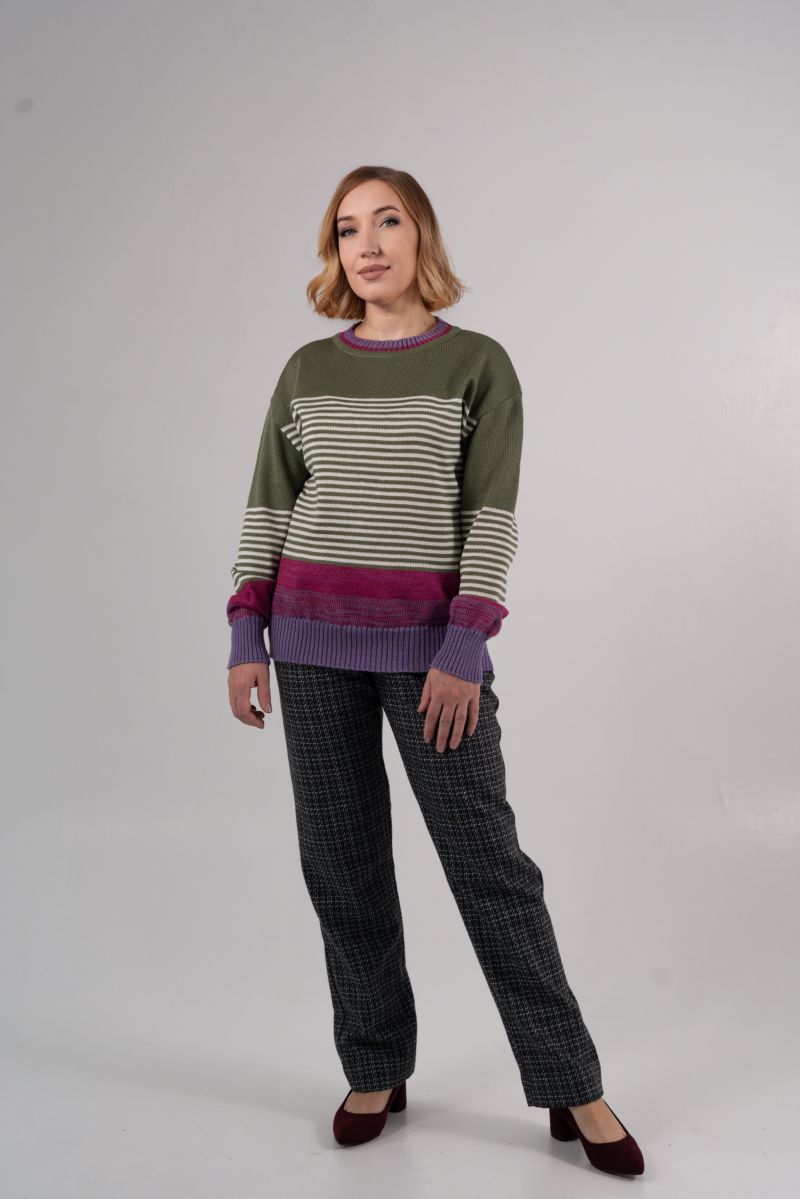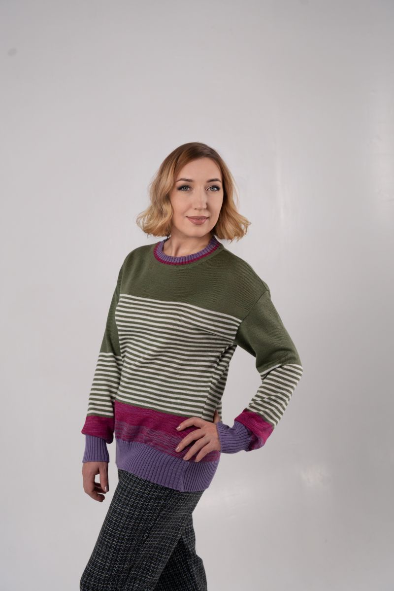 Описание: Джемпер с длинным рукавом, линия плеча спущена, воротник невысокая стойка, трикотаж полосы,
