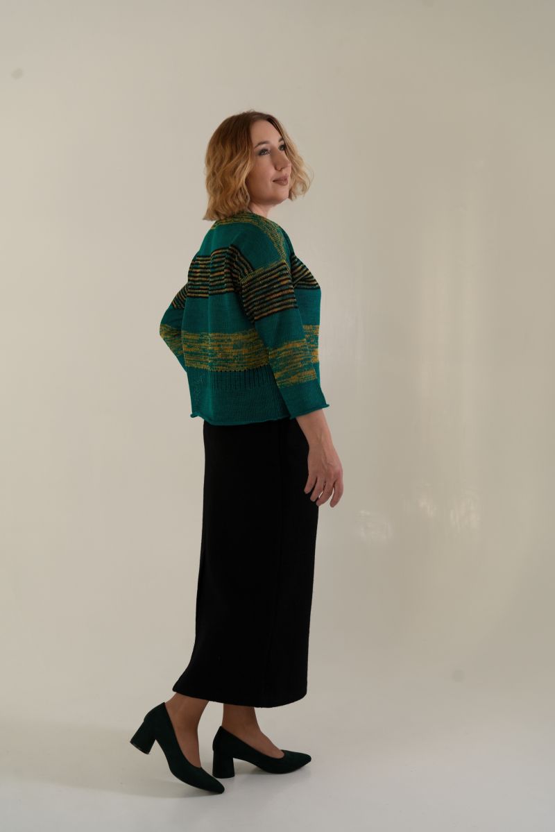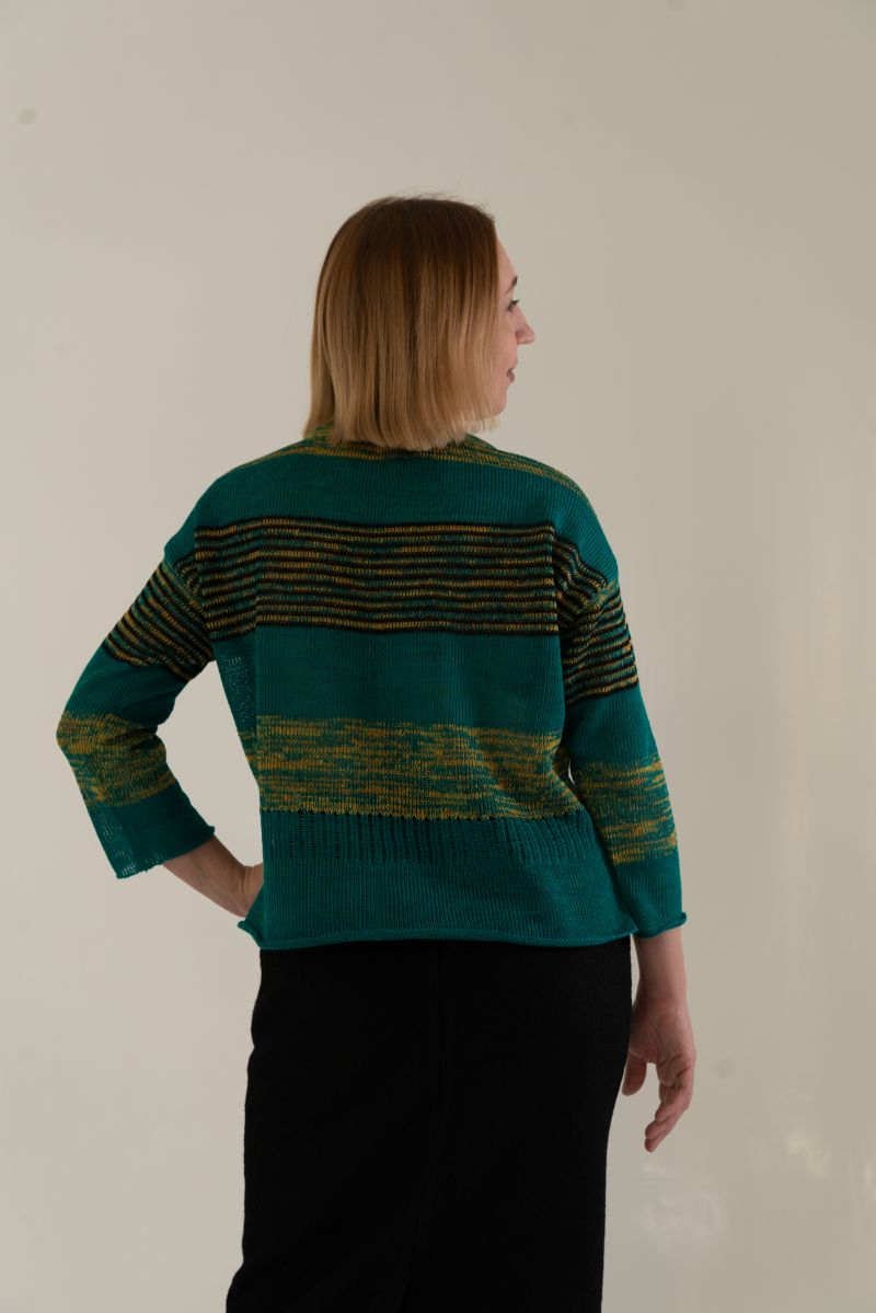 Описание: Джемпер, линия плеча спущена, закручивающаяся линия низа, трикотаж полосы