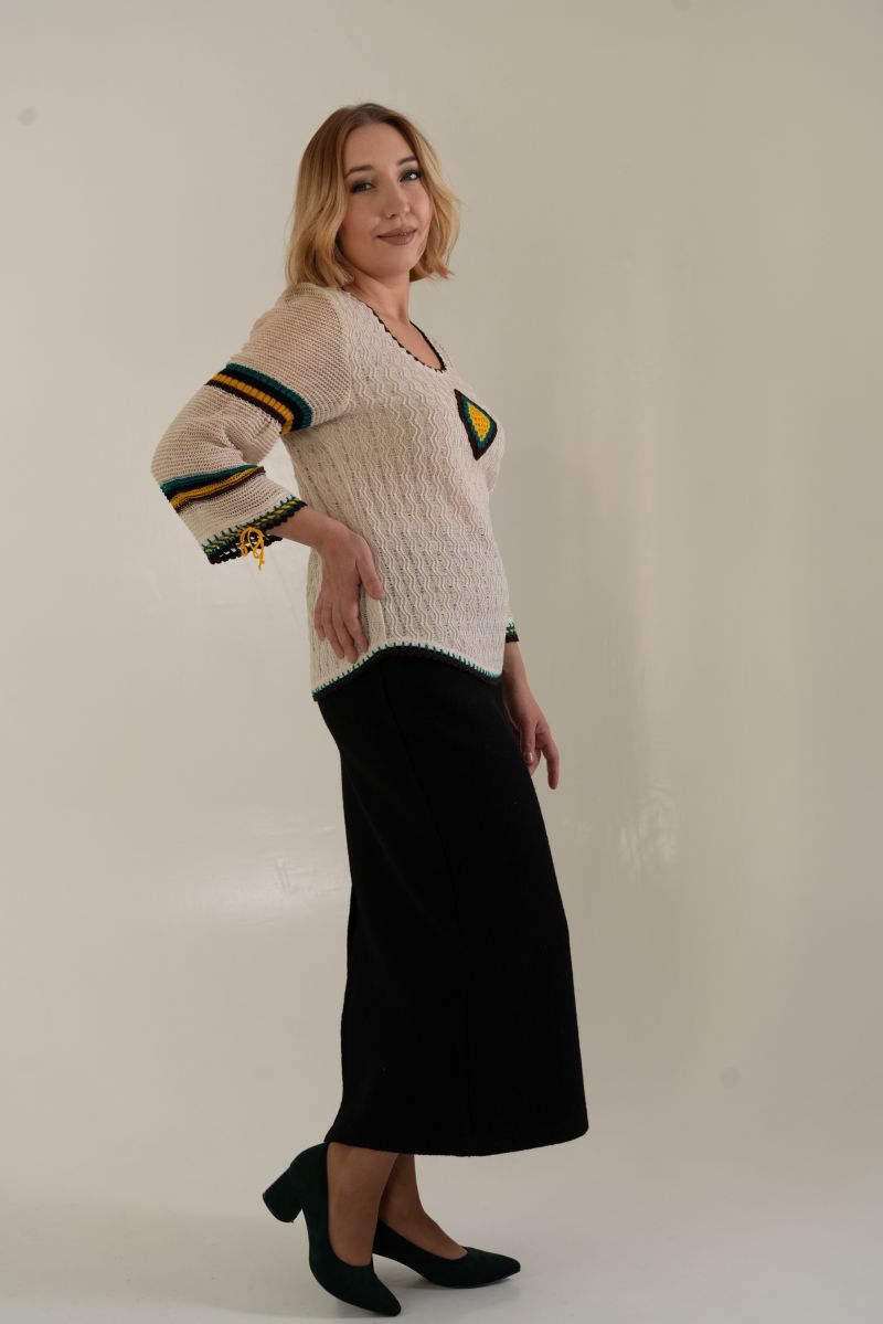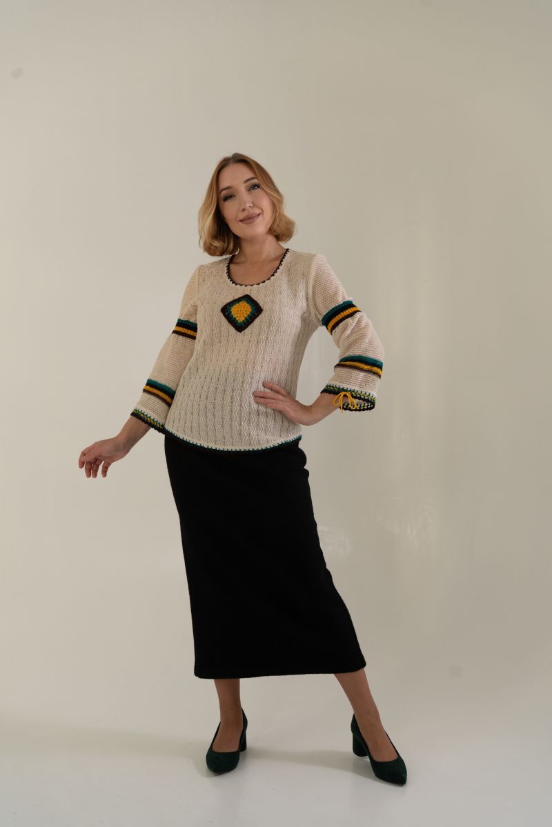 Описание: Джемпер с широким рукавом, неровная линия низа, отделка крючок, трикотаж