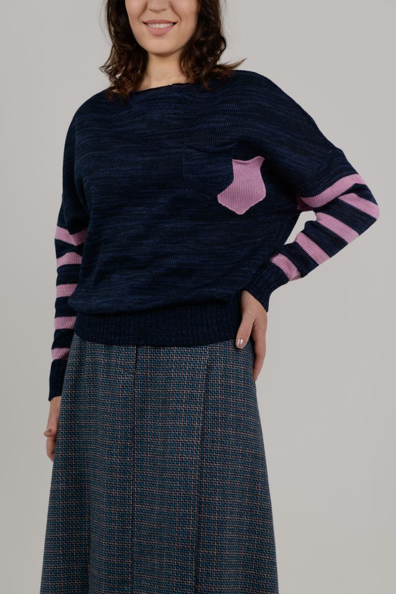 Описание: Джемпер с двумя небольшими карманами, линия плеча спущена, трикотаж.