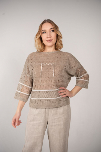 Описание: Джемпер с рукавом на сборке, низ закругленный, трикотаж с ажуром.