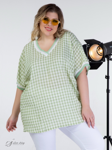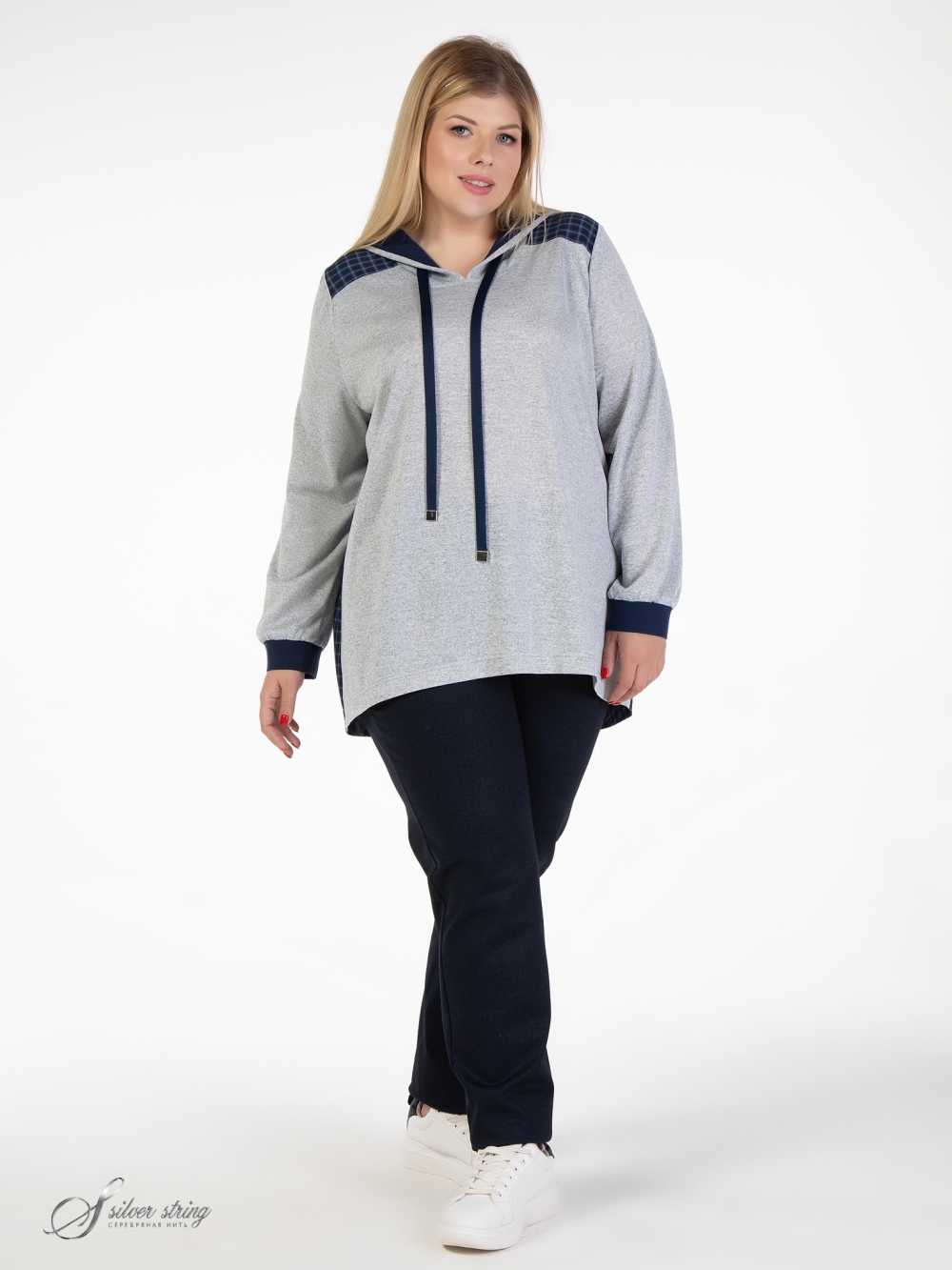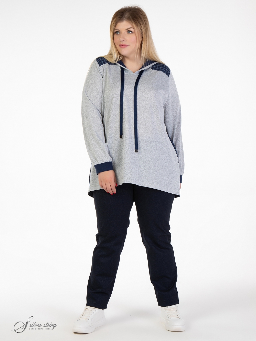 Эффектный блузон прямого силуэта, в спортивном стиле, выполнен из материалов-компаньонов: однотонного трикотажного полотна и ткани с рисунком в клетку. Модель с капюшоном и длинным втачным рукавом. Лицевой вырез капюшона обработан планкой контрастного цвета, и в нее вложен шнур – затяжка. На полочке расположены кокетки. Низ рукава присобран на трикотажную манжету. Модель выполнена с учетом особенностей фигуры полных дам и позволяет обеспечить отличную посадку и максимальный комфорт.