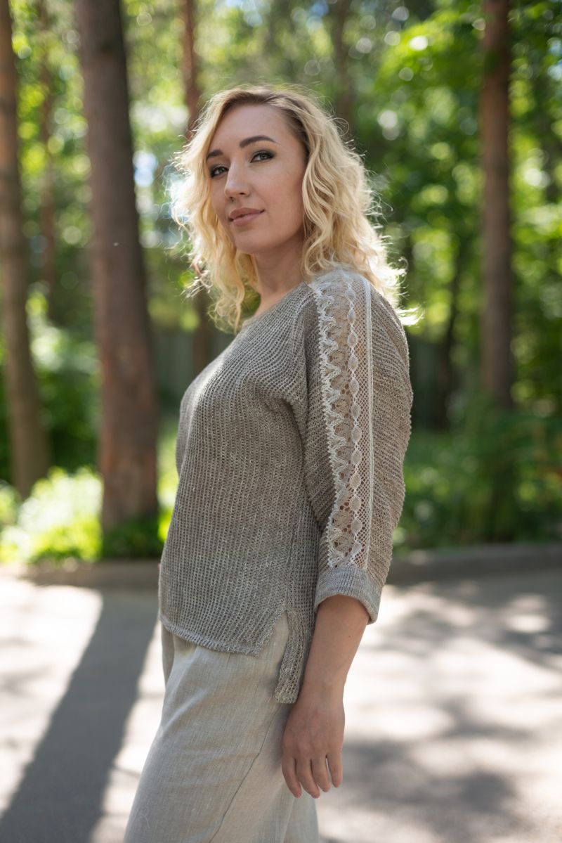 Описание: Джемпер, линия плеча спущена, спинка удлиненная, по бокам разрезы, вставка кружево, трикотаж