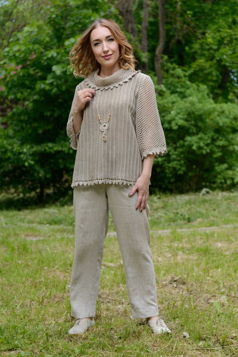 Описание: Джемпер с высоким воротником хомут, рукав длиной 3/4, отделка крючок, украшение, трикотаж с ажуром.