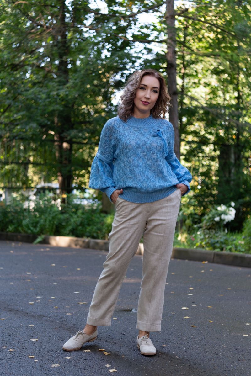 Описание: Джемпер, линия плеча спущена, рукав на сборке, отделка, трикотаж