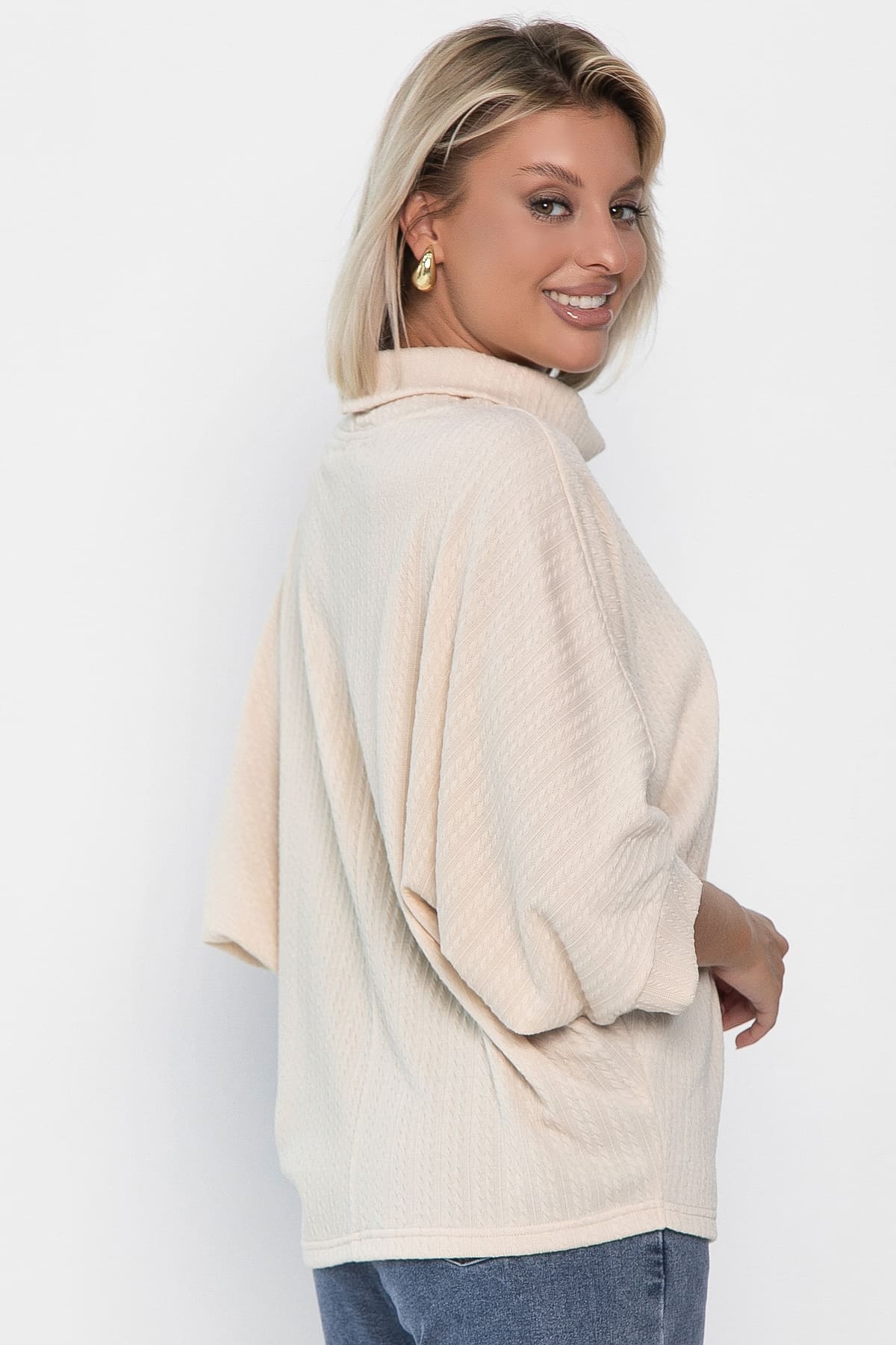 Самые непредсказуемые ансамбли и живописные образы позволяет создать джемпер, вписывающийся в самые разнообразные стили. Удобное, практичное, функциональное изделие позволит сочетать его с разнообразным низом, а мягкий трикотаж подарит комфорт в прохладную погоду. Джемпер имеет акцентную горловину, а рукава скроены по типу «летучая мышь». Свободный крой позволит скрыть недостатки фигуры.