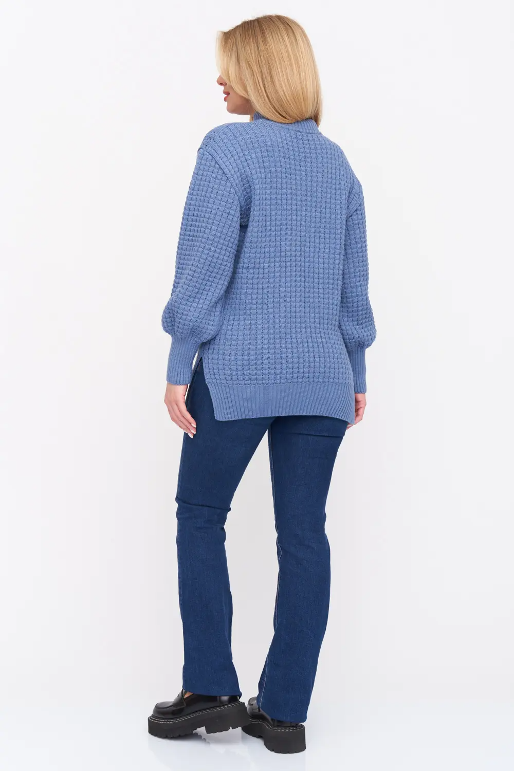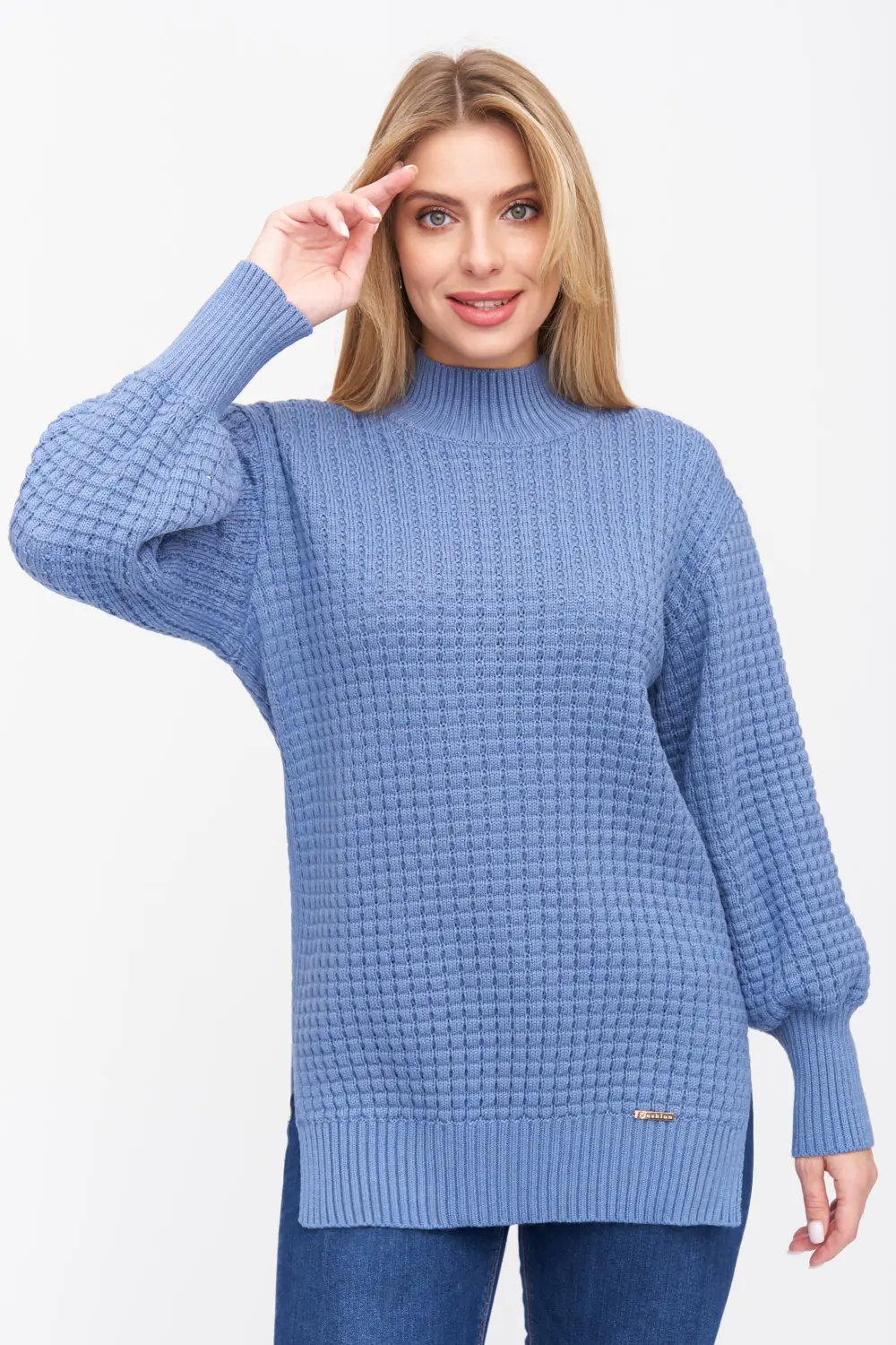 Женский джемпер с воротником-стойка. Спущенная линиия плеча и длинный рукав. Стильная модель выполнена из дышащей, износостойкой, мягкой акриловой пряжи с добавлением полиэстера и шерсти. Поэтому джемпер не только прекрасно смотрится, но и комфортно сидит на любой фигуре, не теряет форму и цвет даже после множества стирок. Отлично сочетается с джинсами, брюками и юбками. джинс