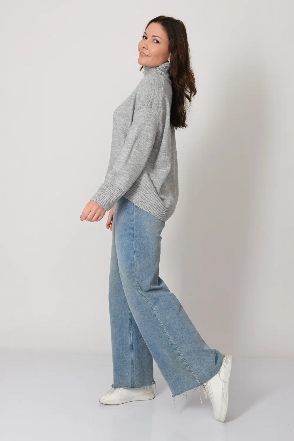 Женский джемпер с воротником-стойкой добавит выразительности в повседневный гардероб и станет любимым его элементом. Выполнен из пряжи с добавлением шерсти. Джемпер с длинным рукавом имеет комфортный в меру свободный силуэт, спущенную линия плеча, которая делает образ более расслабленным, и воротник-стойку.Ворот, манжеты и низ выполнены плотной резинкой, которая отлично держит форму и не растягивается. Прекрасно дополнит офисные луки в сочетании с юбками, а также идеально впишется в образы на каждый день с любимыми джинсами, брюками. серый