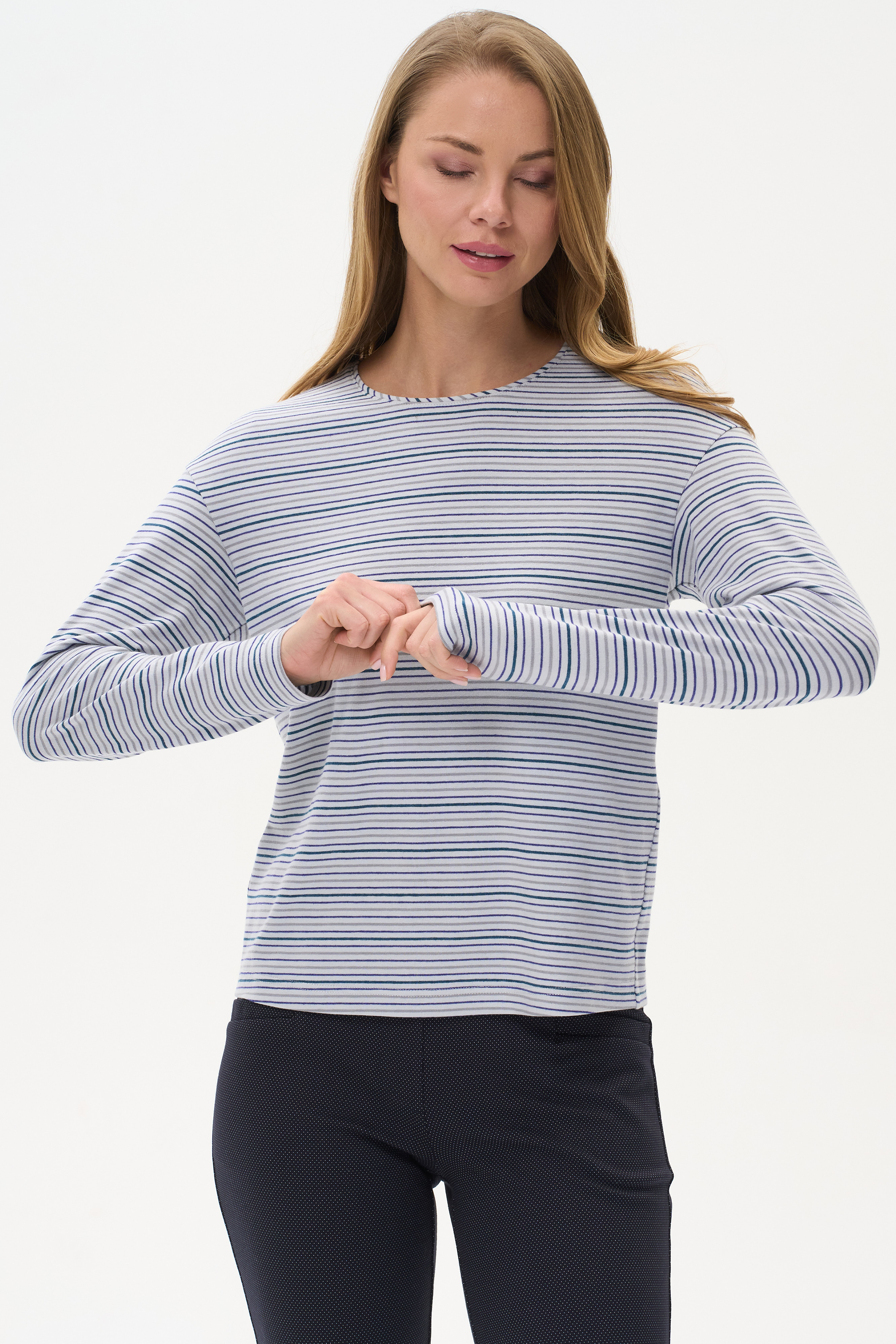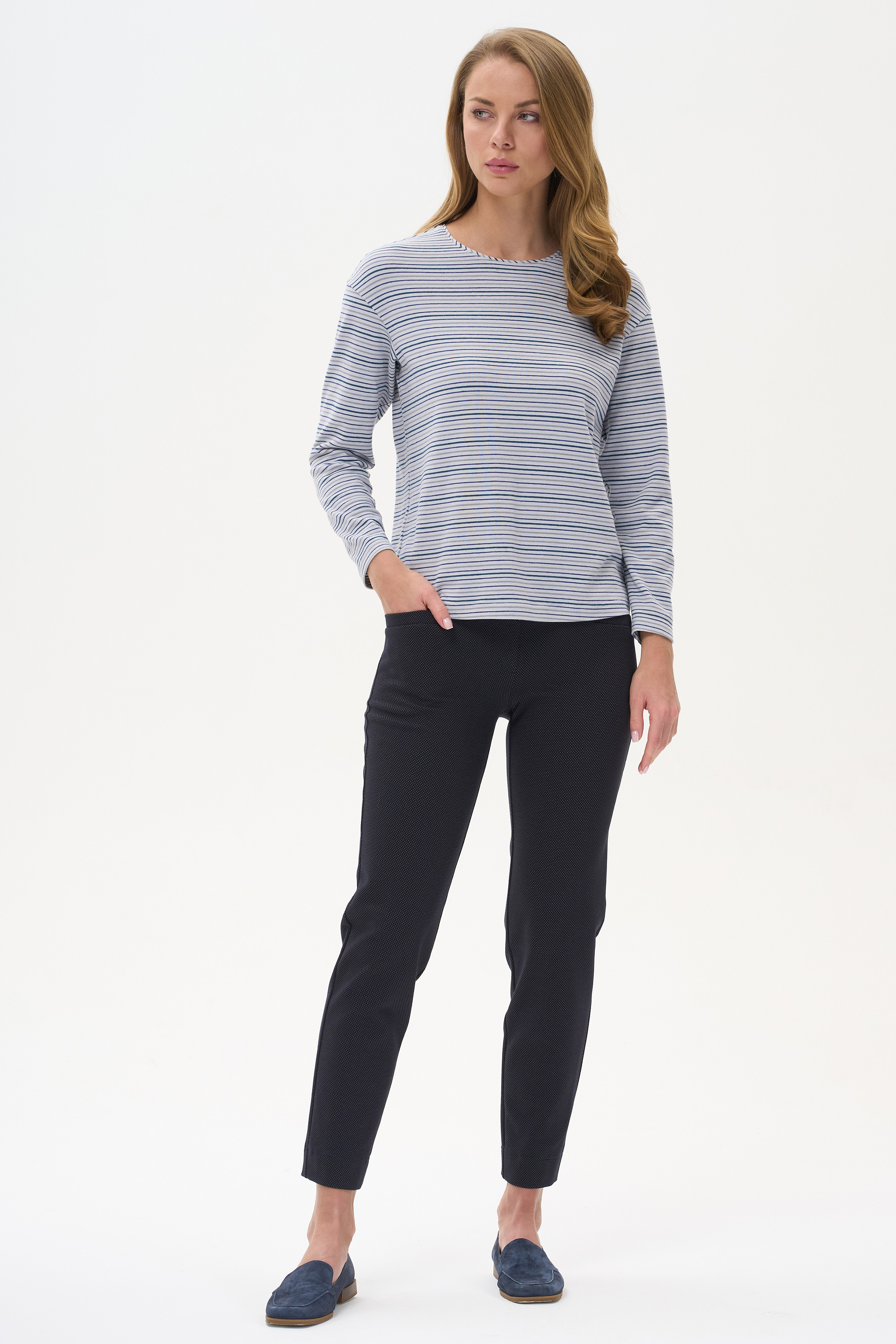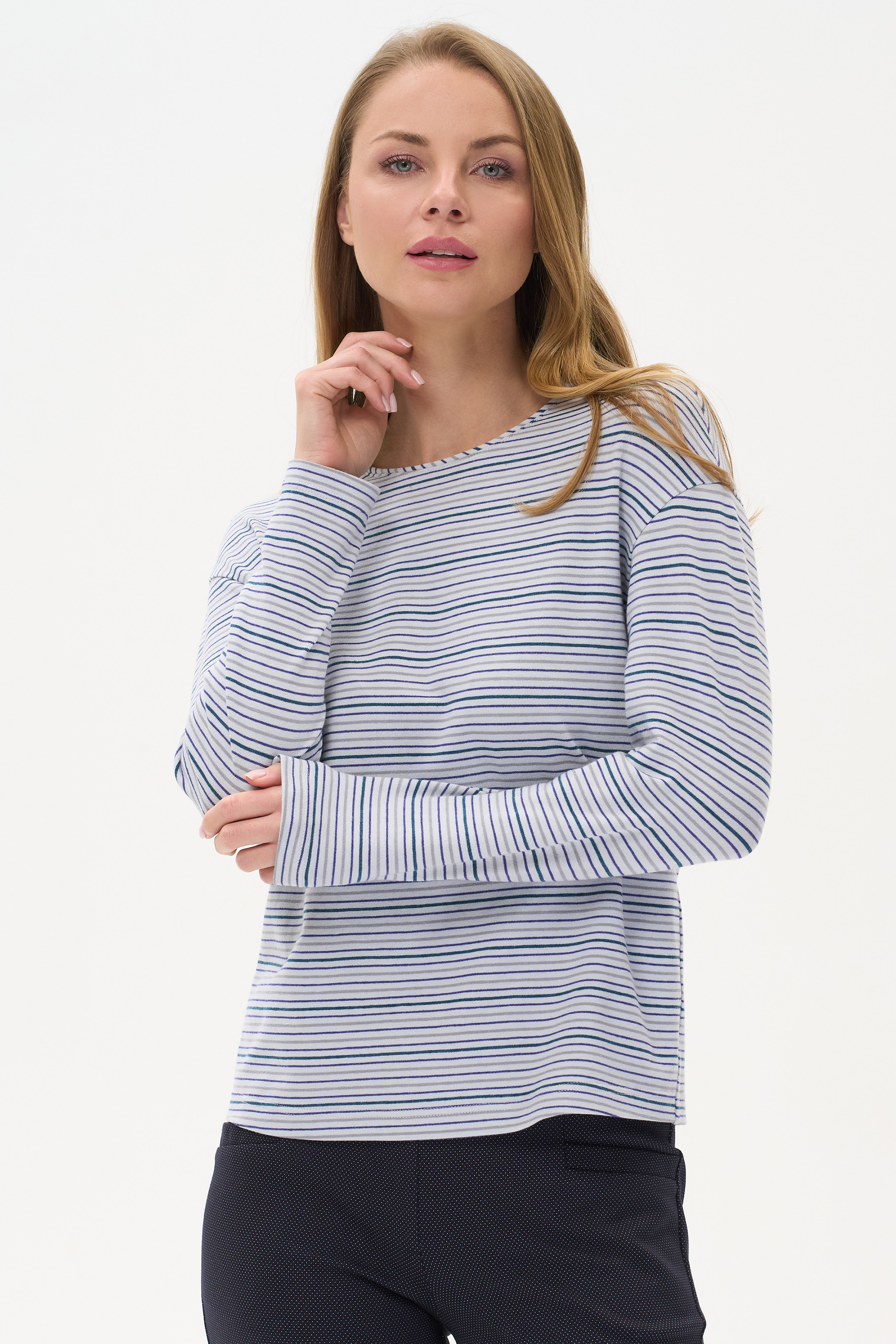 Джемпер с длинным рукавом из вязаного двустороннего полотна. Хлопковый состав с небольшим добавлением ПЭ даёт мягкость и ощущение теплоты. Тактильно очень приятное. 83% хлопок,15% полиэстер, 2% эластан