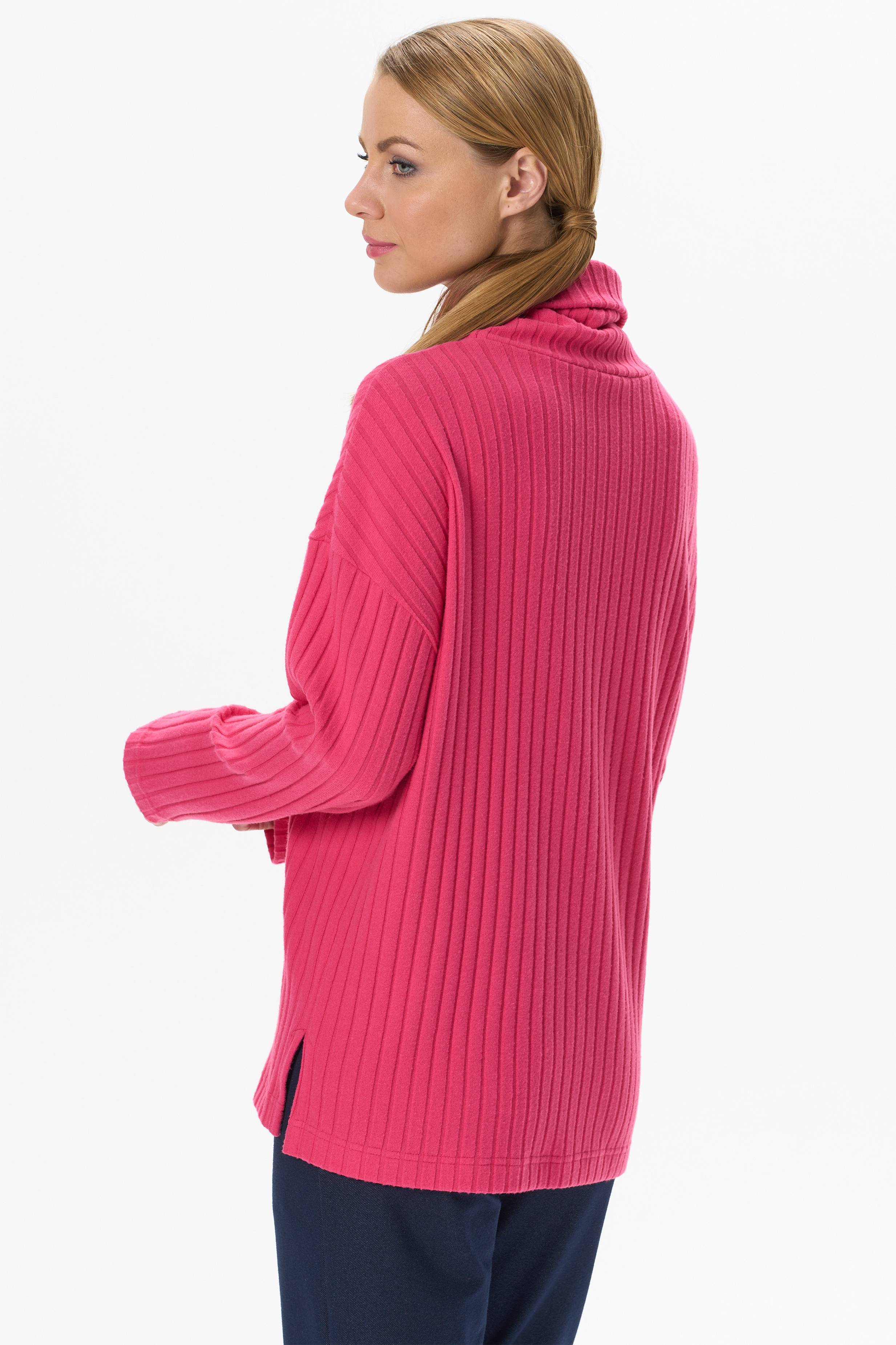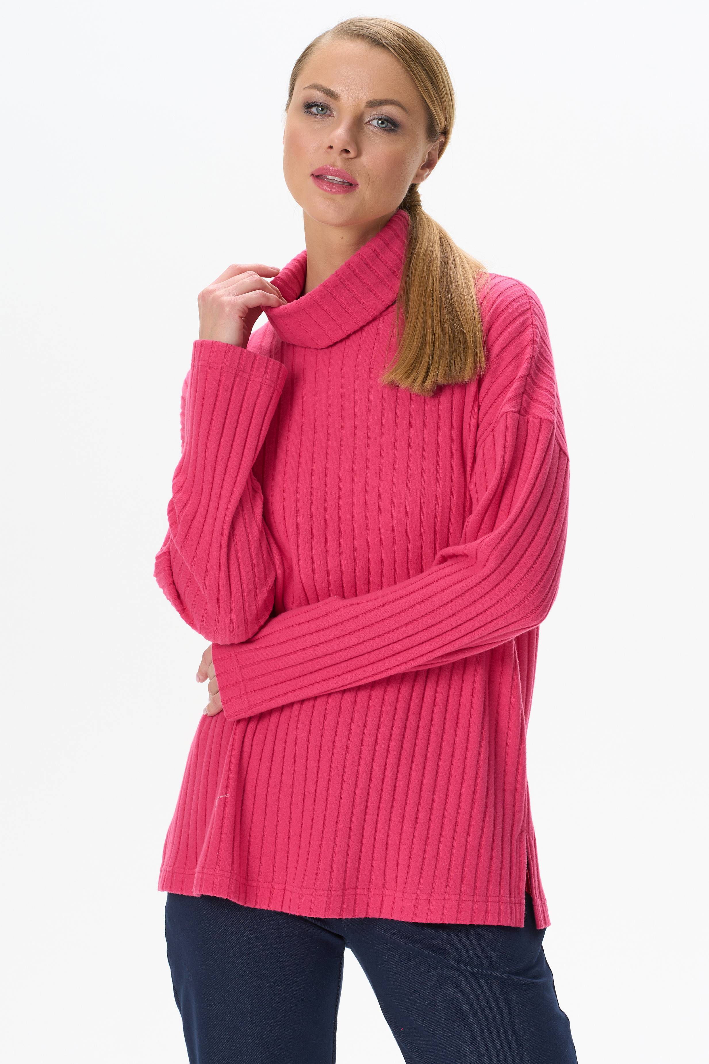 Джемпер из хлопкового фактурного полотна с эластаном. Воротник стойка, длинные втачные рукава, по низу в боковых швах разрезы. Рост модели на фото 177