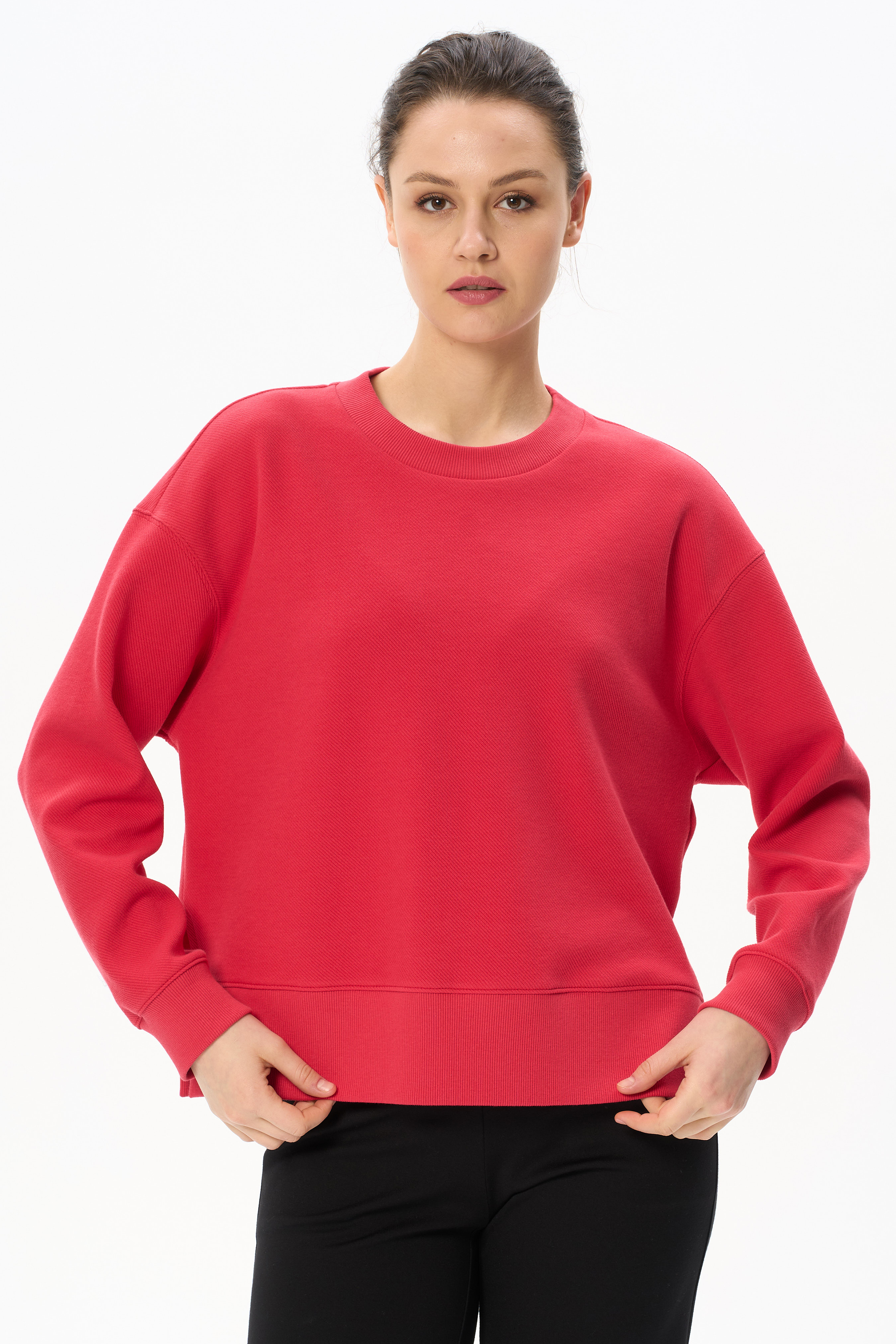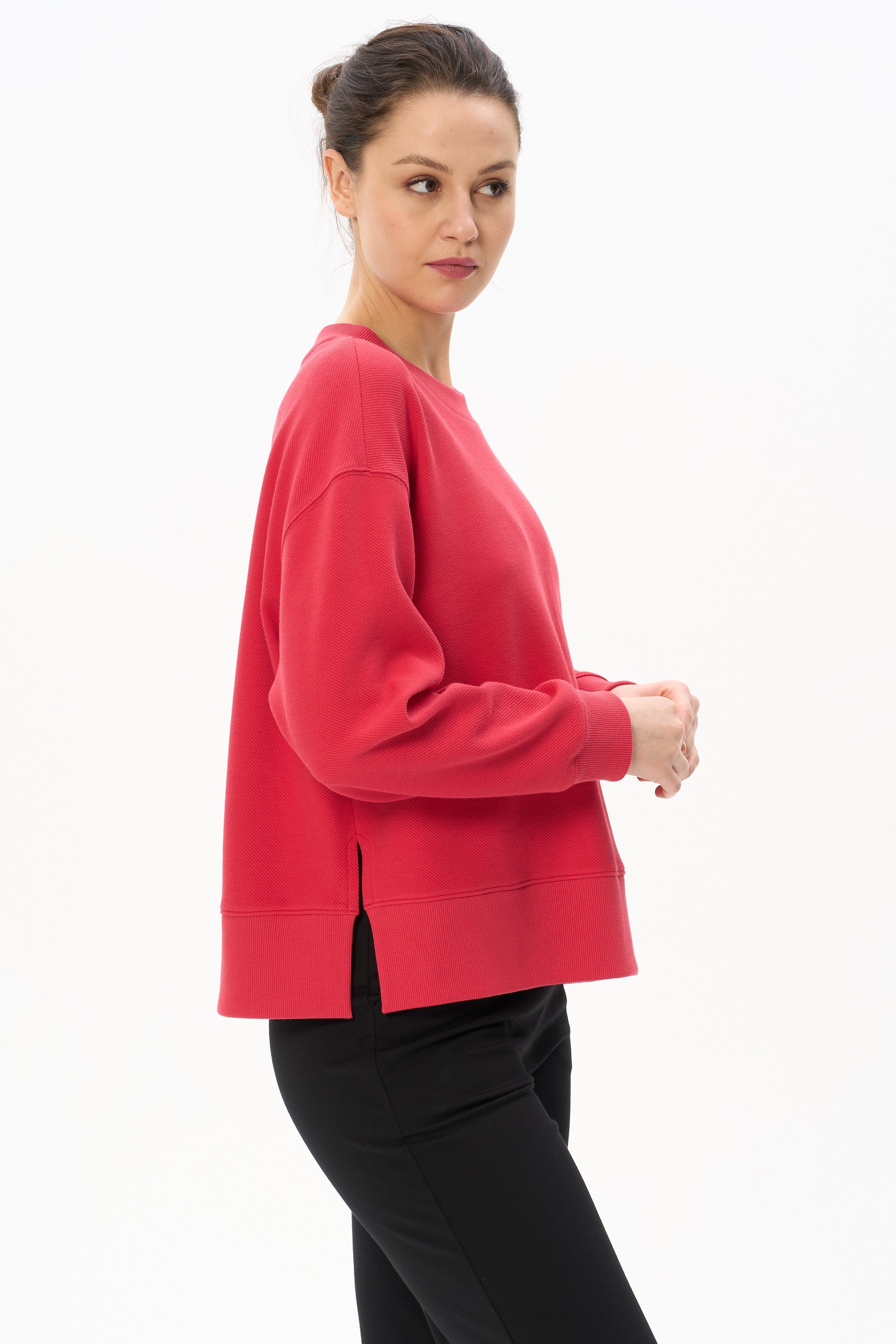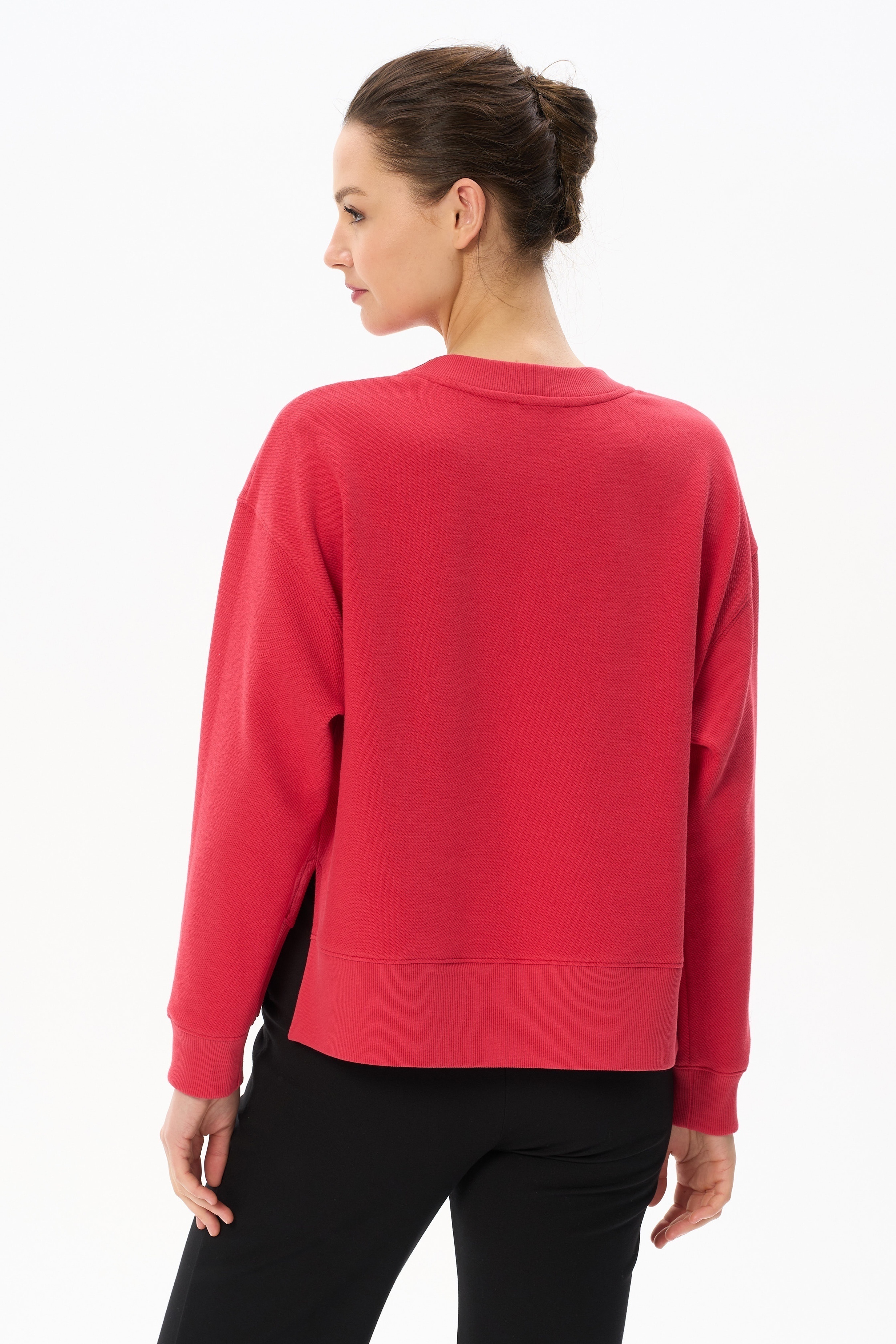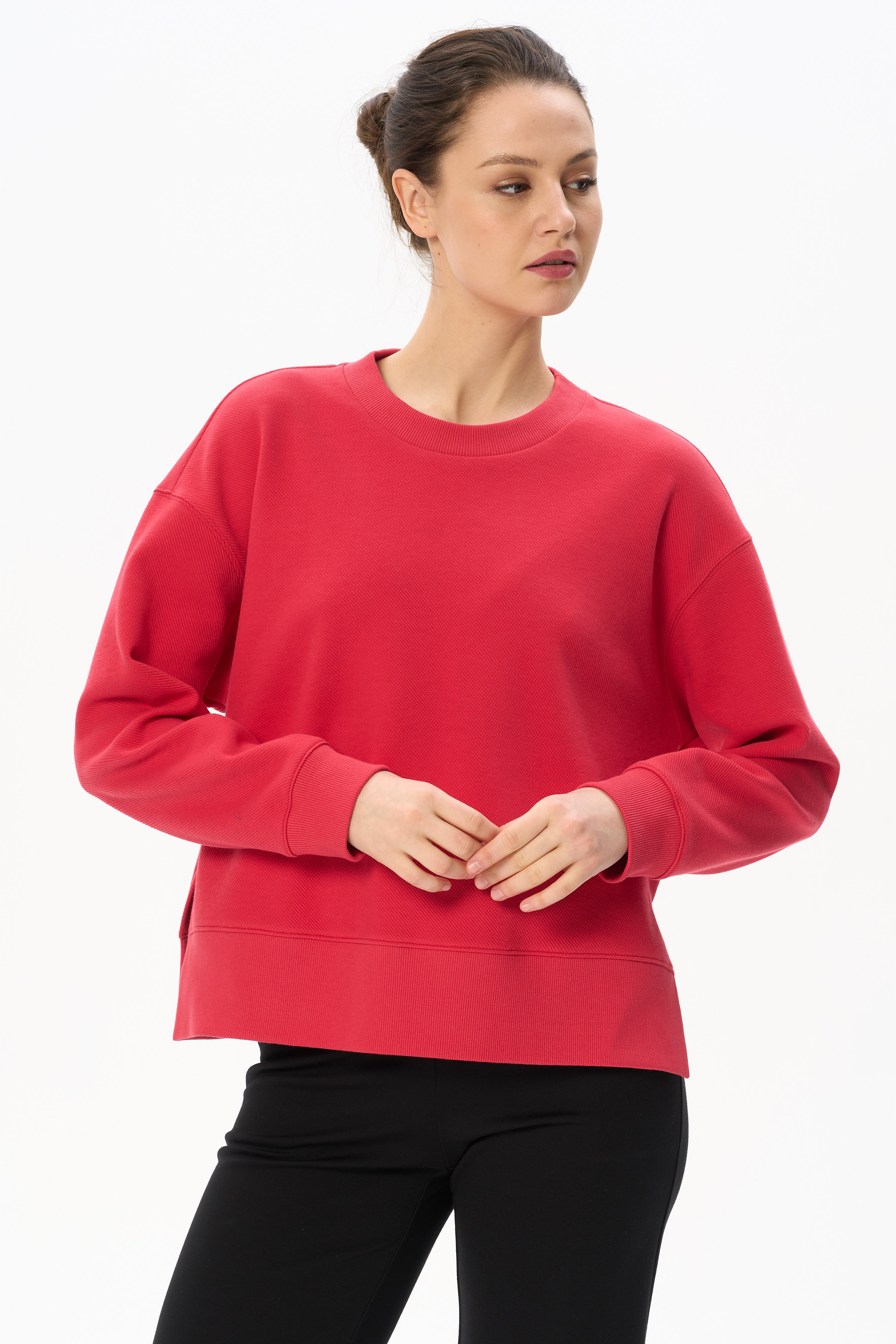 Джемпер модной свободной формы выполнен из нового жаккардового полотна с диагональным рубчиком, по свойствам напоминающим футер. Круглый вырез горловины оформлен планкой, длинные втачные рукава с манжетами. По низу боковых швов разрезы. Планка, манжеты и широкая обтачка по низу изделия выполнена из кашкорсе в цвет. Рост модели на фото 178.
