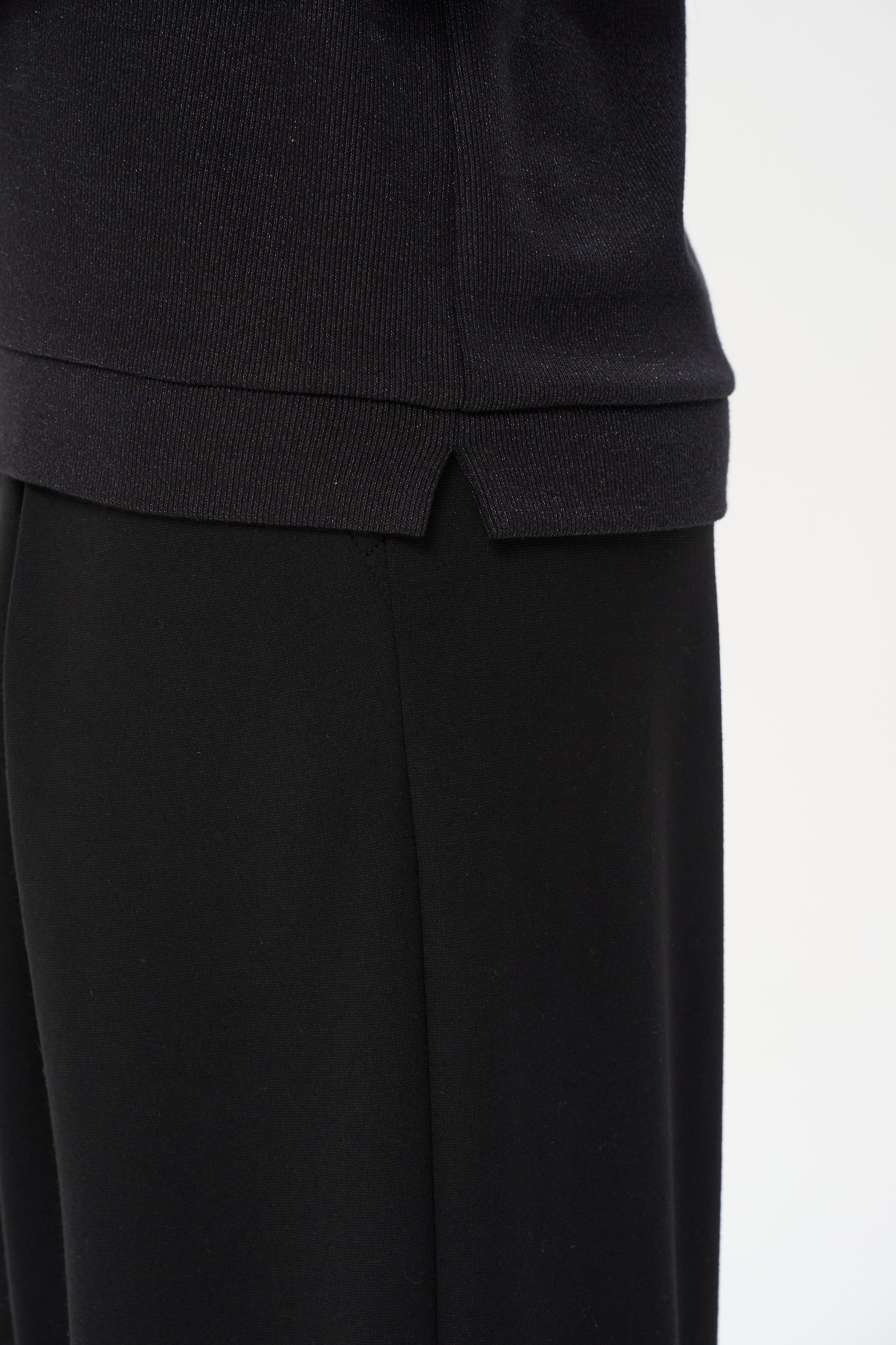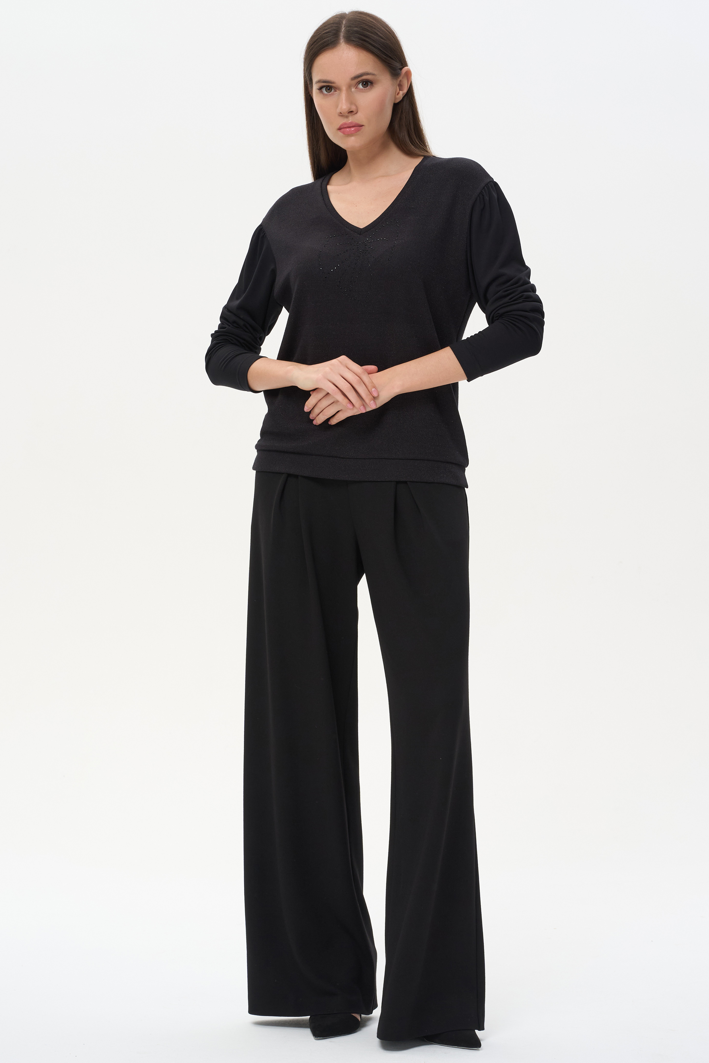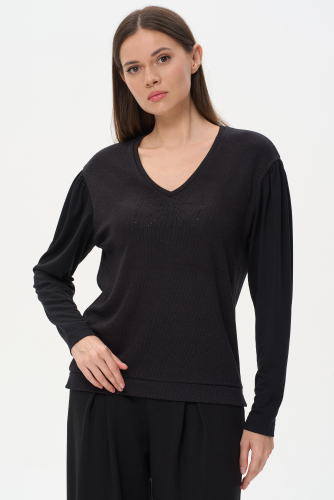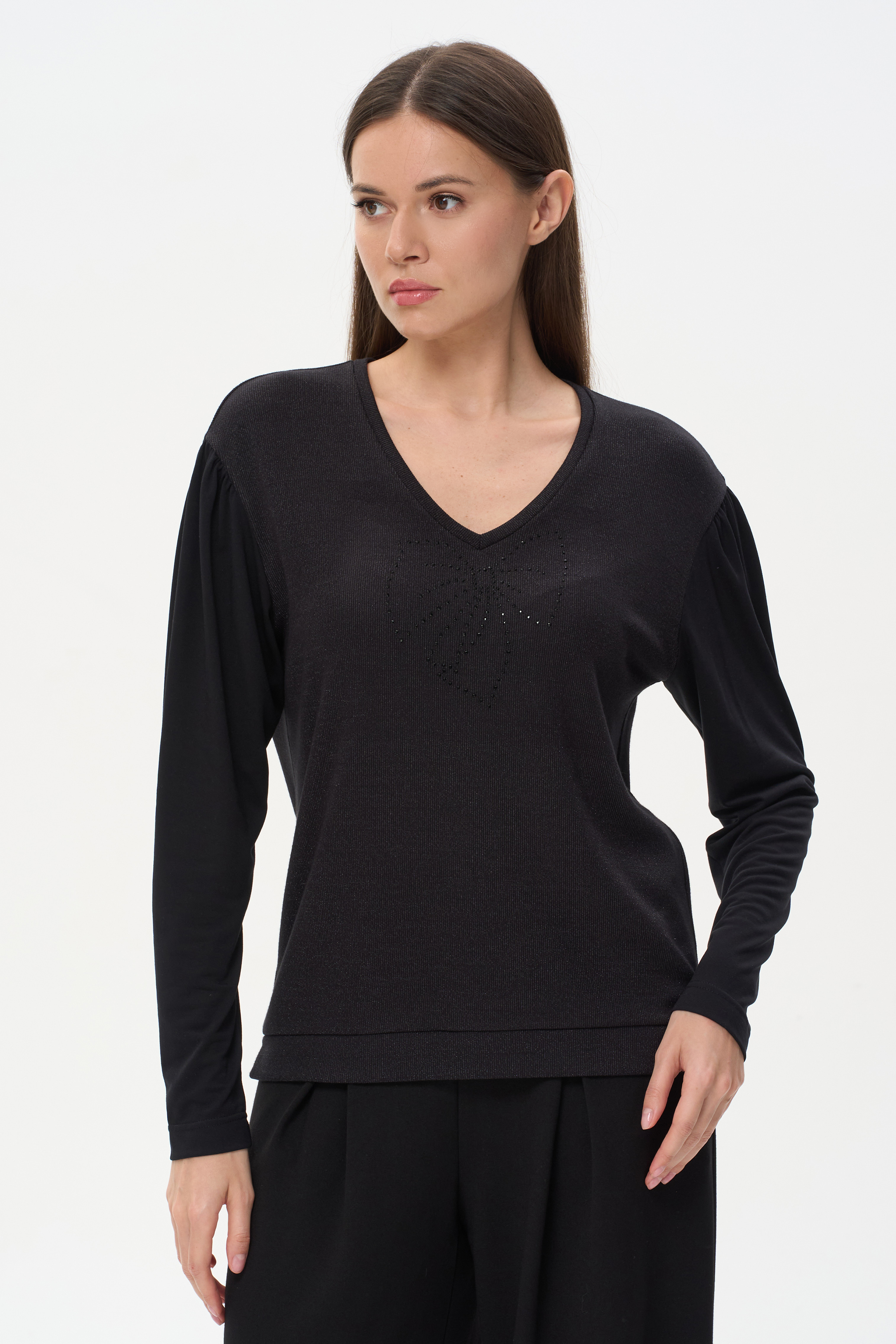85% вискоза/ 13% полиэстер/ 2% эластан Нарядный свободный джемпер с V-образным вырезом комбинированный: спинка и полочка из мягкой рибаны с деликатным блеском, рукава длинные из модала. На полочке дизайнерский рисунок из чёрных страз в виде банта.