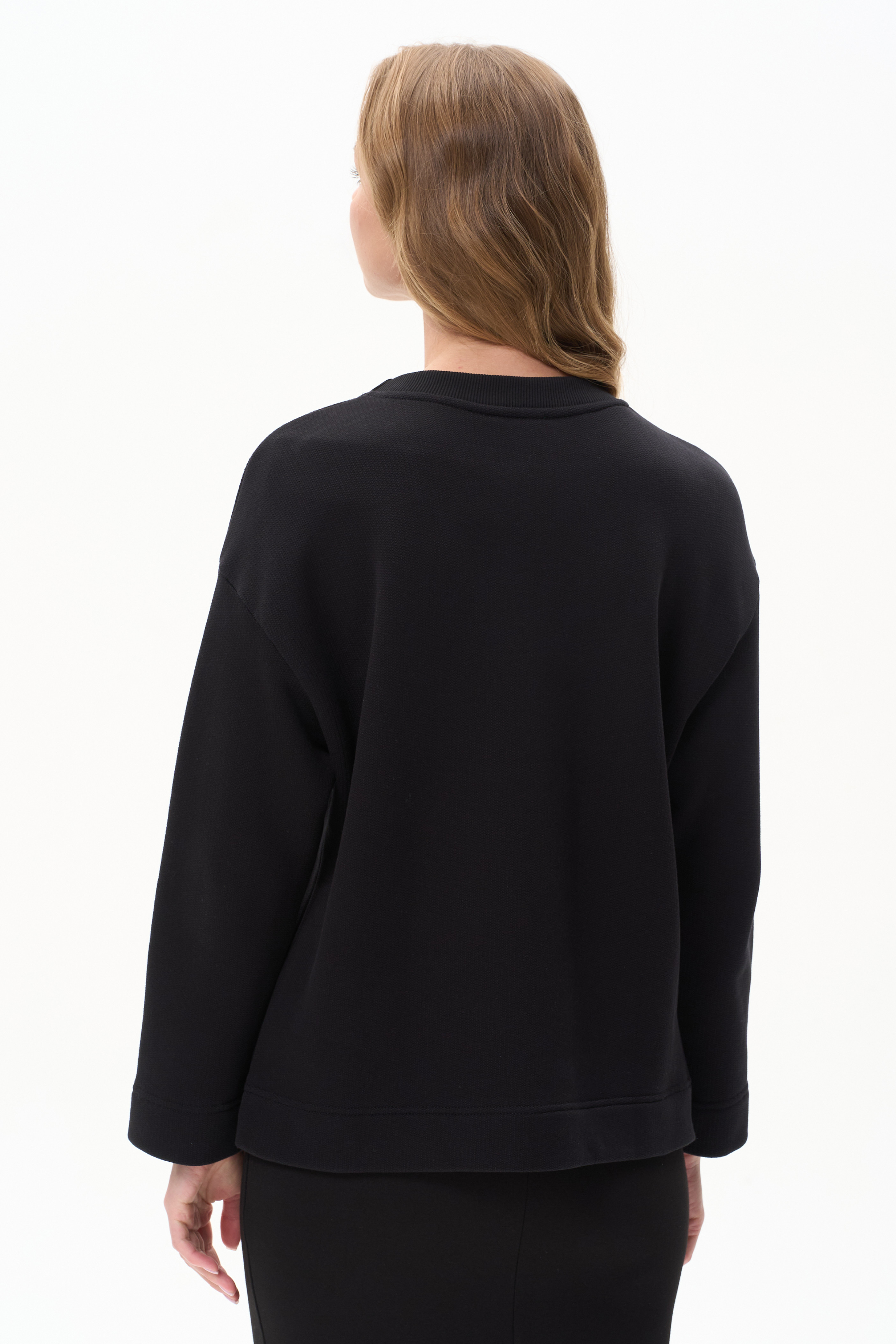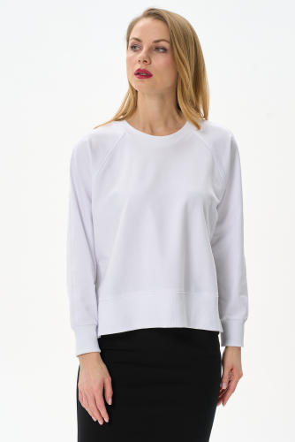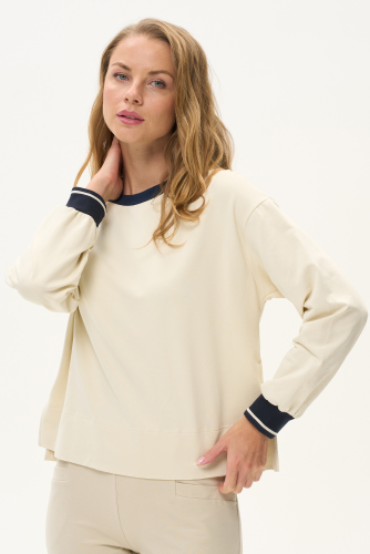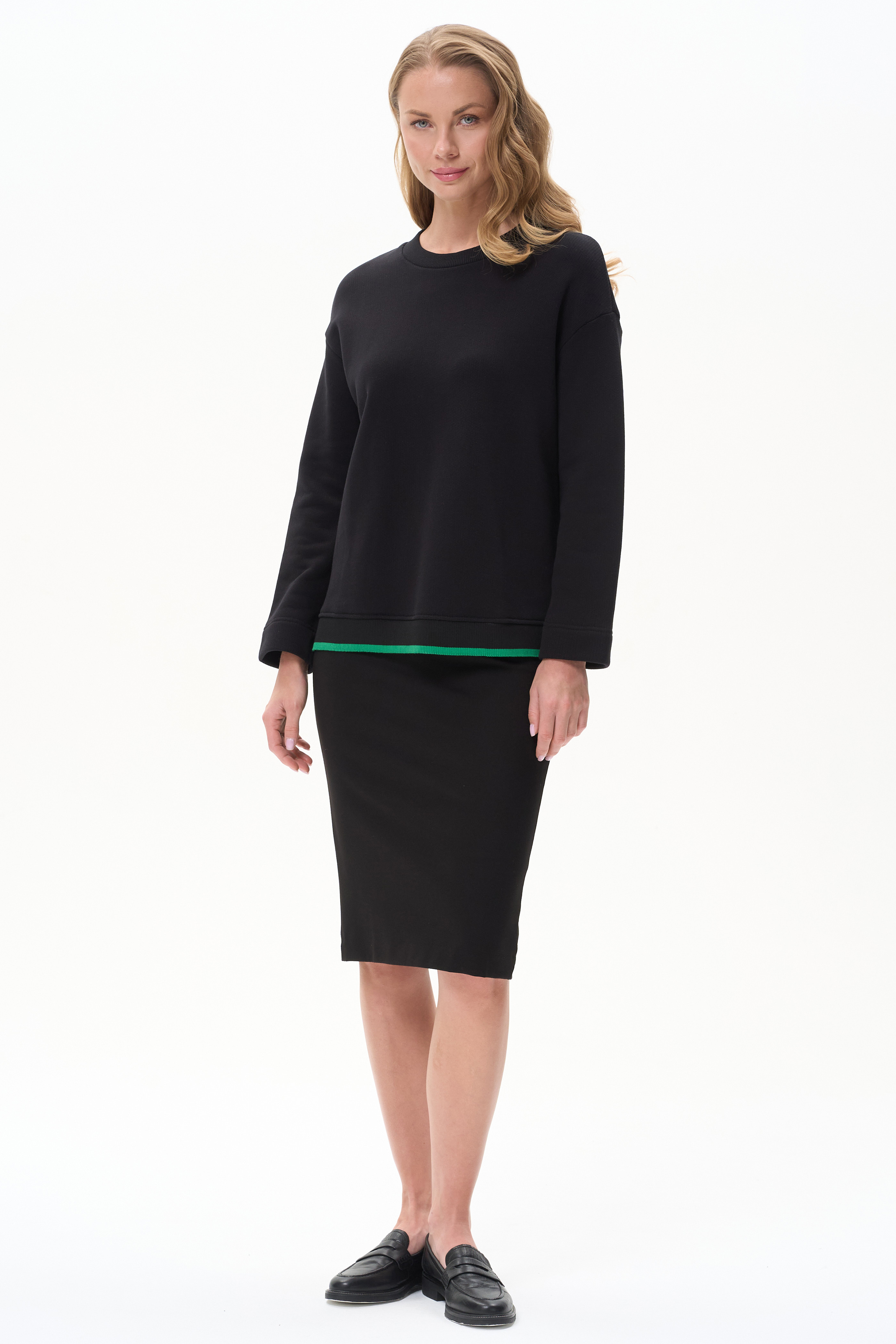 100% хлопок Модный джемпер выполнен из нового трикотажного полотна - футер с фактурной лицевой стороной и крупной петлёй с изнанки. Тесьма по нижней части полочки с контрастной полосой зеленого цвета, которая сочетается с цветом киперной ленты по горловине внутри. Свободный крой со спущенными рукавами. Круглый вырез горловины оформлен планкой из кашкорсе. Рост модели на фото 178см.