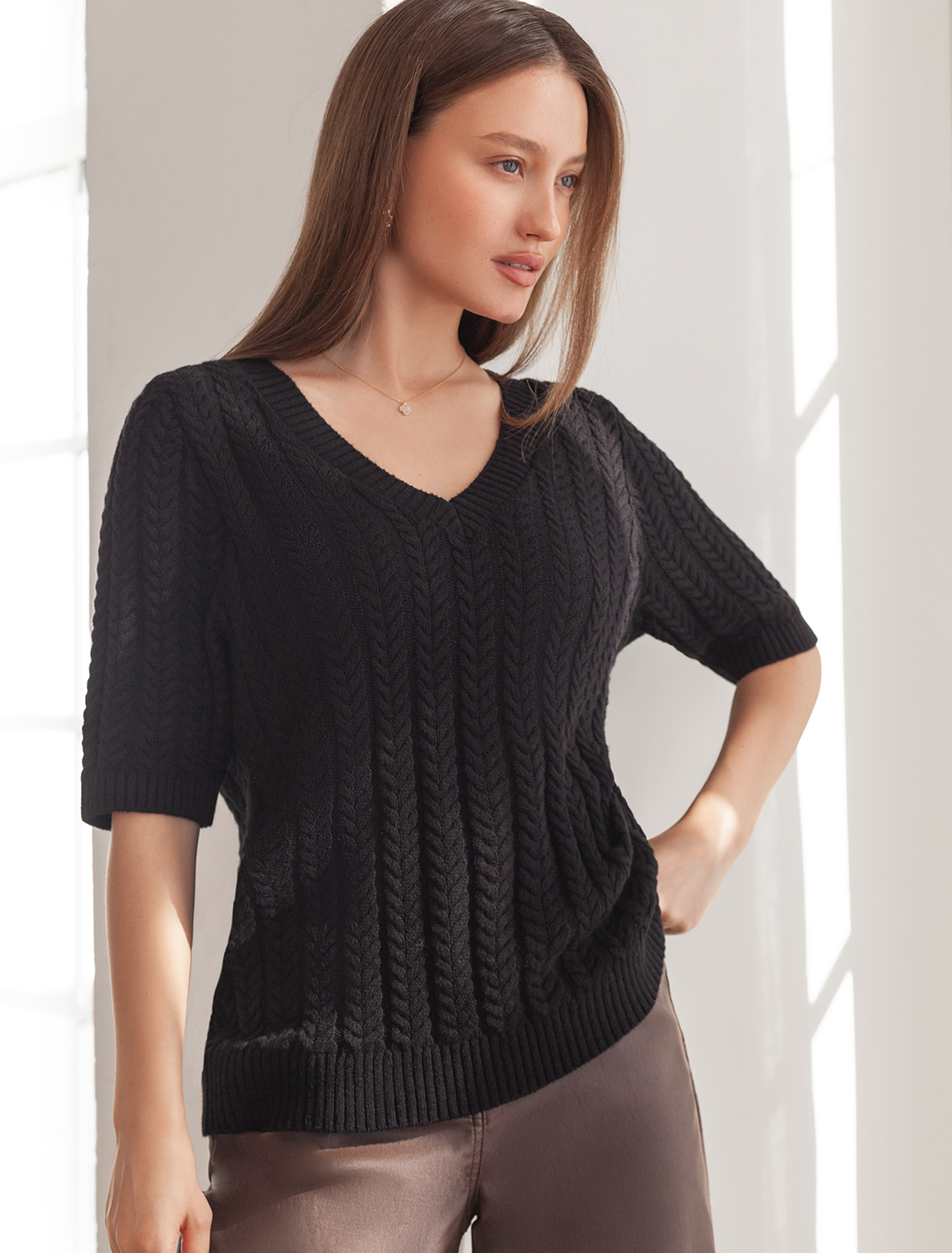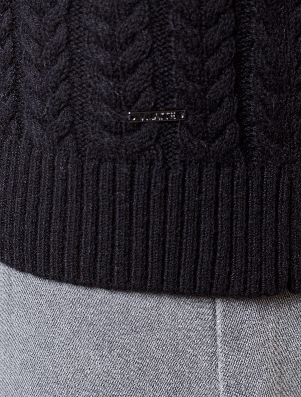 Джемпер фактурной вязки выполнен из хлопка с добавлением кашемира. Модель с V-вырезом с вывязанным орнаментом цепи. Мягкая и очень приятная пряжа совершенно не колется, сохраняет тепло при этом не перегревая, гарантируя безупречный комфорт. черный