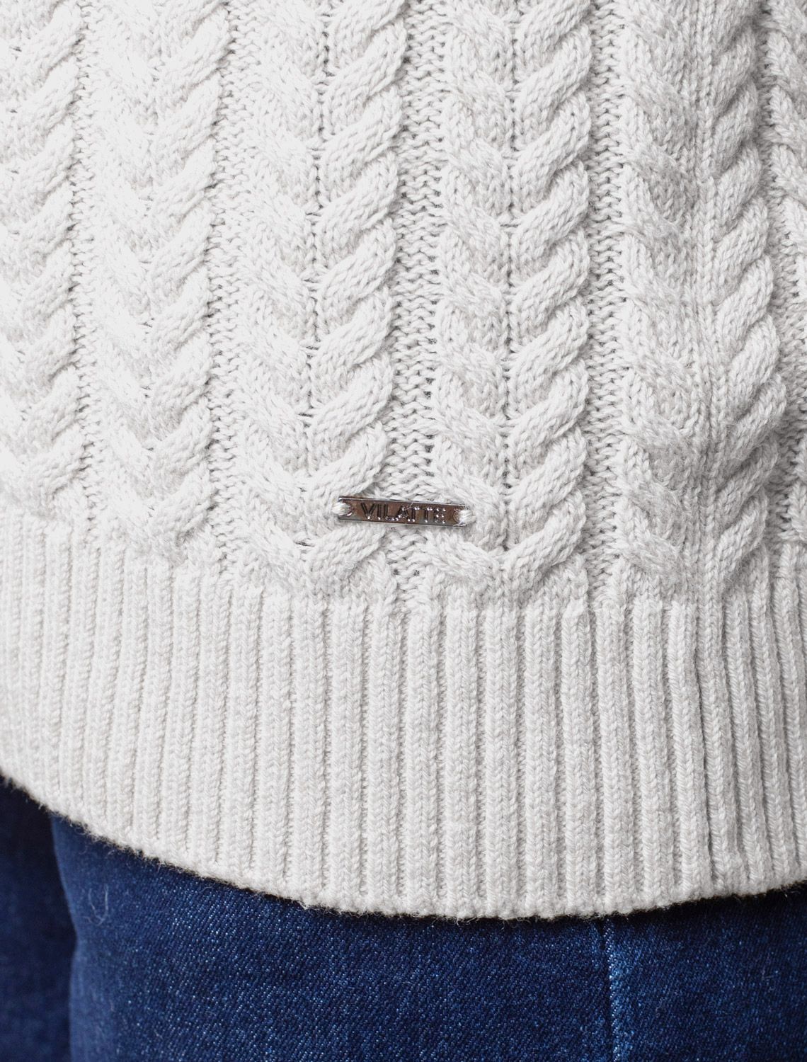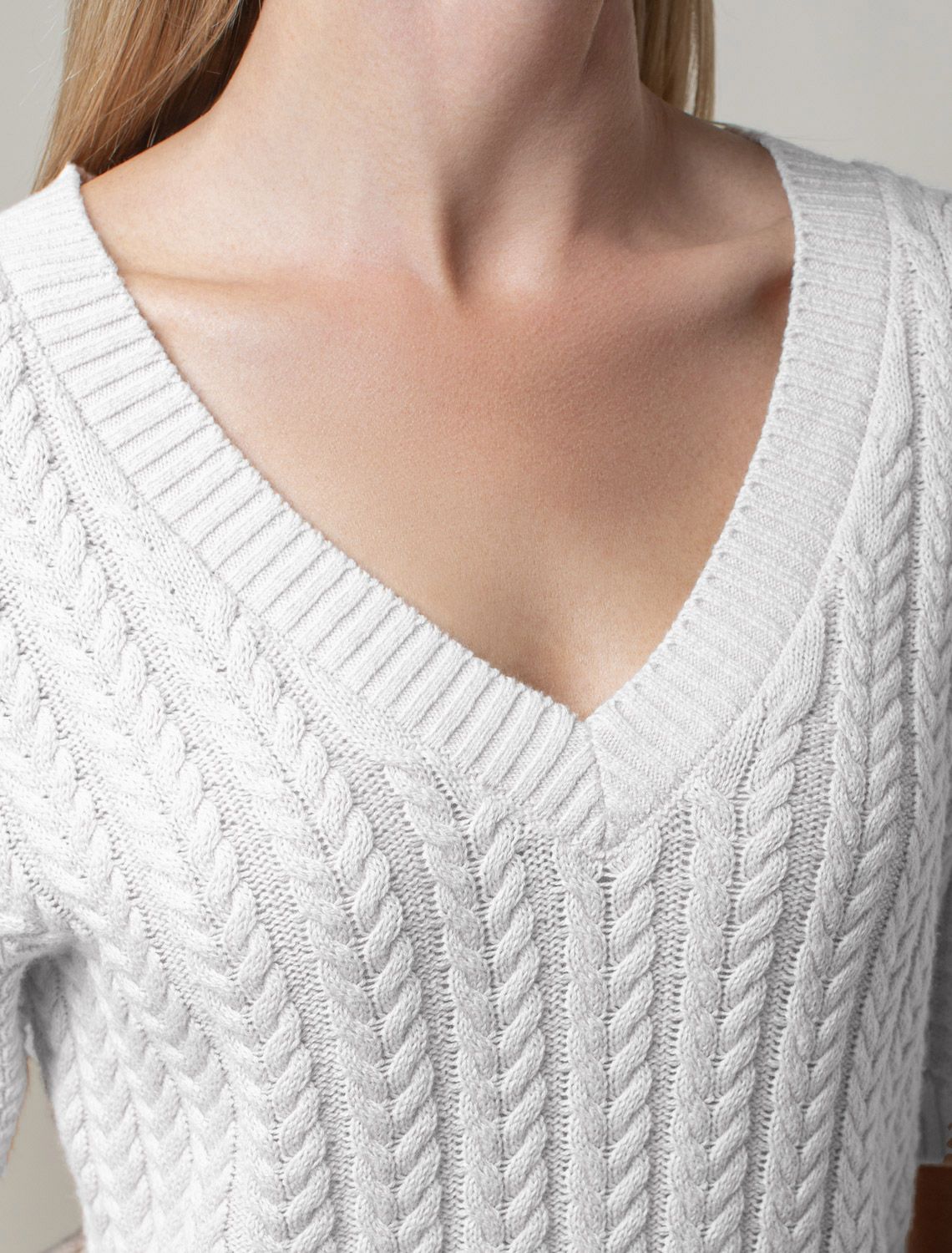 Джемпер фактурной вязки выполнен из хлопка с добавлением кашемира. Модель с V-вырезом с вывязанным орнаментом цепи. Мягкая и очень приятная пряжа совершенно не колется, сохраняет тепло при этом не перегревая, гарантируя безупречный комфорт.