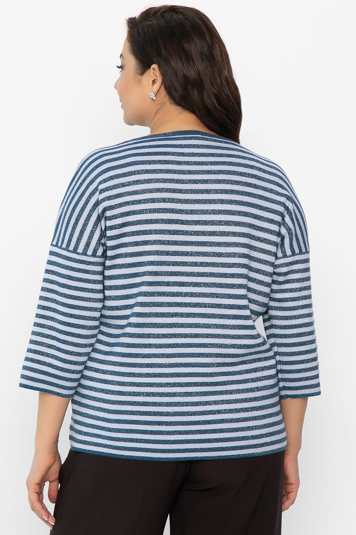 Универсальный джемпер с классическим полосатым принтом станет незаменимым элементом гардероба. Он изготовлен из трикотажа с добавлением люрекса, что придает ему особый шарм. На груди пришита небольшая аппликация из бисера, которая добавляет образу изюминку и завершенность. Этот джемпер идеально подходит для создания повседневных образов, сочетая в себе комфорт и современный стиль.