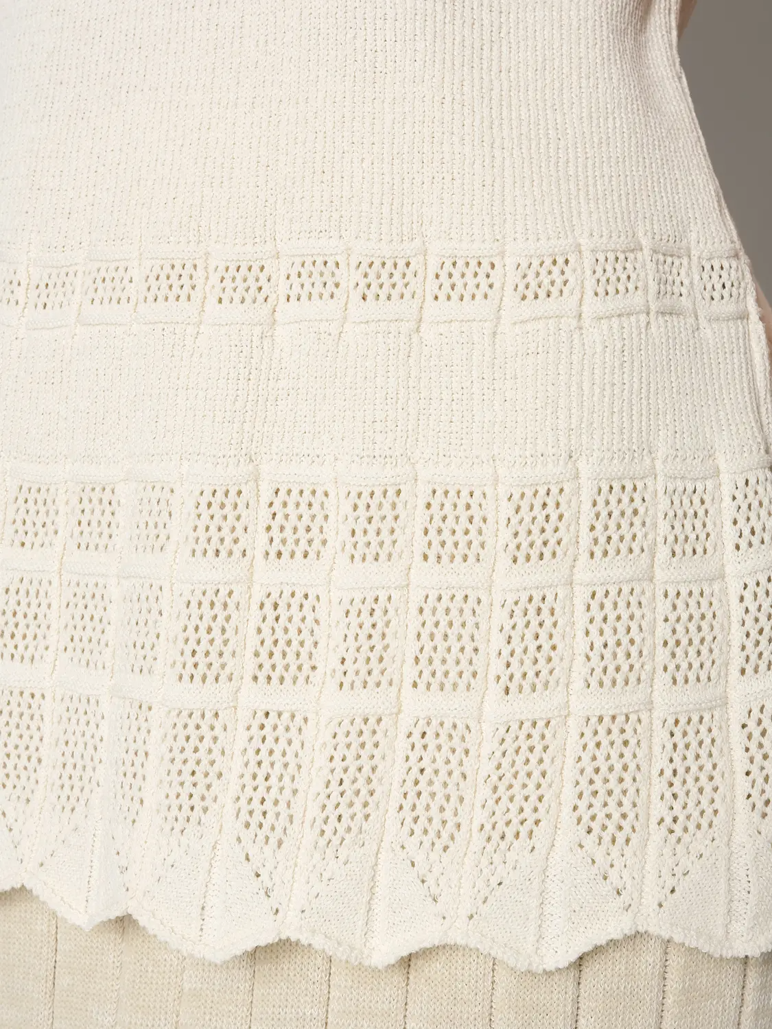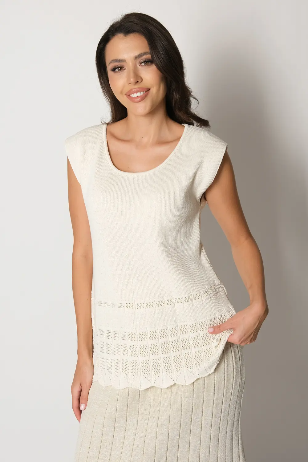 Женский вязаный джемпер полуприлегающего силуэта со спущенным плечом. Ворот круглый. Джемпер выполнен кулирной гладью, нижняя треть изделия-ажурным переплетением с эффектом перфорации. Джемпер можно носить в комплекте с юбкой И 019, выполненной аналогичным переплетением и узором. льняной