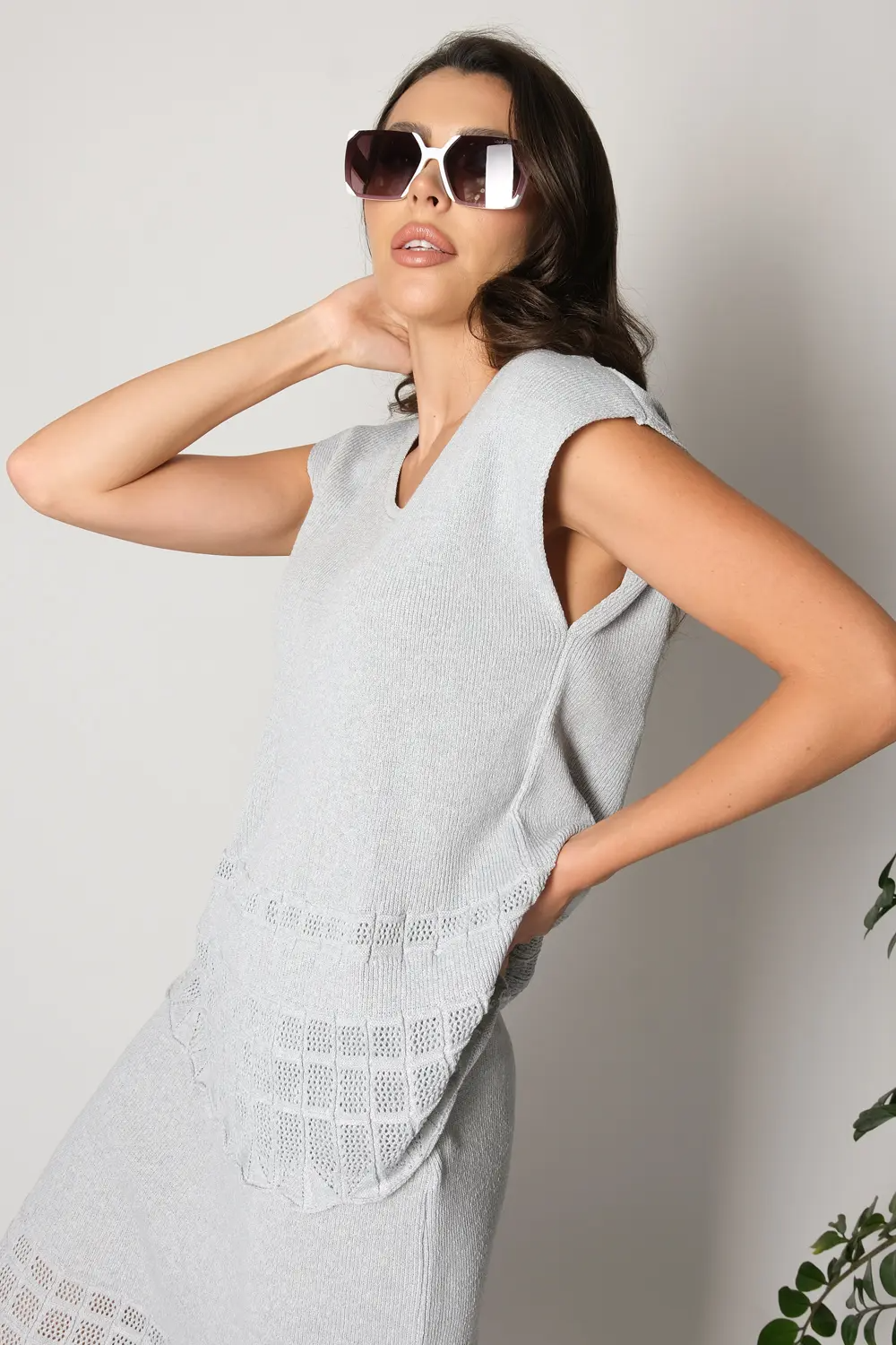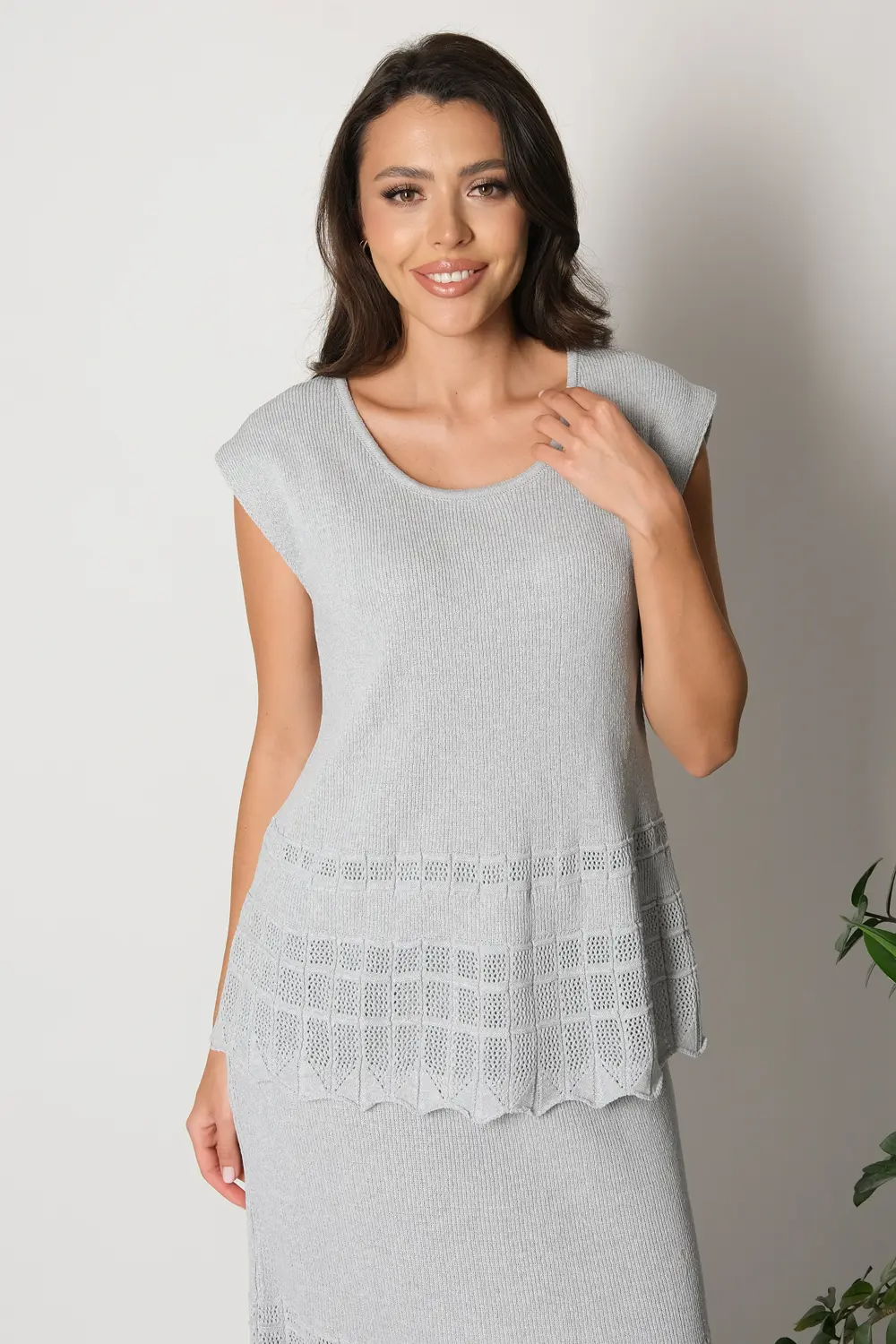 Женский вязаный джемпер полуприлегающего силуэта со спущенным плечом. Ворот круглый. Джемпер выполнен кулирной гладью, нижняя треть изделия-ажурным переплетением с эффектом перфорации. Джемпер можно носить в комплекте с юбкой И 019, выполненной аналогичным переплетением и узором. св.серый
