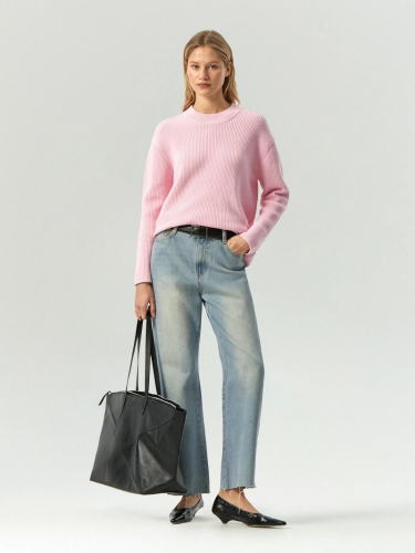 Свитер крупной вязки из натурального хлопка радует глаз мягким оттенком розового. Модель оверсайз можно стилизовать ремнями, использовать как второй слой на комбинации и лёгкие платья, носить с юбками разных фактур, денимом и костюмными брюками