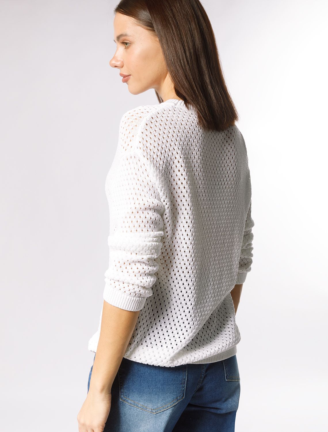 Джемпер связан фактурным узором из пряжи на основе крученой вискозы с лиоцеллом. Изделие, получилось плотное но достаточно легкое, приятно ощущается на теле, поэтому в нем будет комфортно даже в жаркое время года. Можно носить с бежевым бельем или хлопковым топом. белый