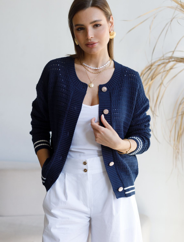 Джемпер выполнен из хлопковой пряжи. Модель украшена контрастными полосами с добавлением мягкого люрекса с деликатным сиянием. Благодаря натуральному составу в изделии будет комфортно в любое время года. Свободный силуэт подходит для любой фигуры.