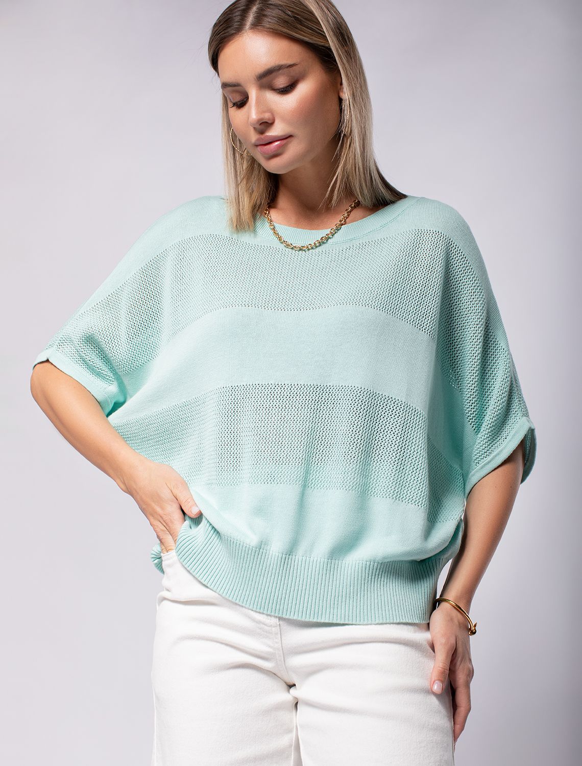 Джемпер выполнен из хлопка с вискозой и фактурными полупрозрачными полосками. Свободная модель подходит для любой фигуры. Идеально подойдет в теплую летнюю погоду, в изделии будет комфортно и не жарко. В сочетании с белым денимом получится завершенный расслабленный образ. Модель украшена металлическим логотипом бренда. аквамарин