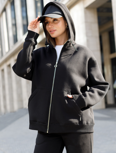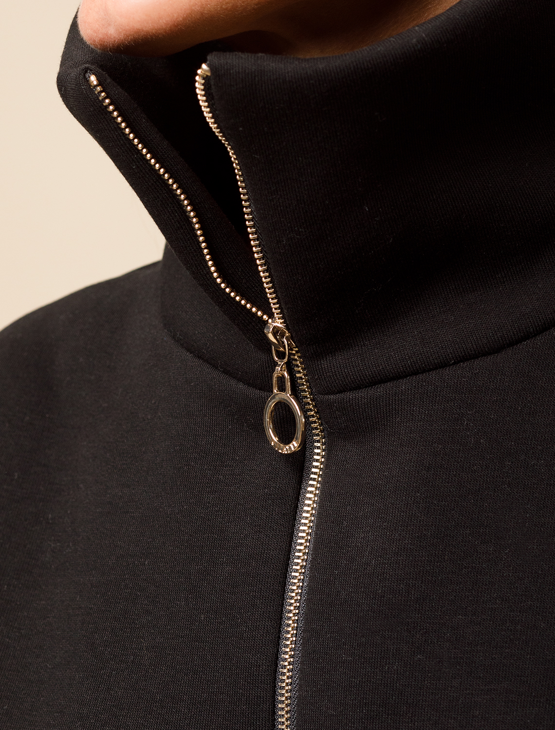 Джемпер с воротом стойкой на молнии выполнен из премиального футера трехнитки с теплым начесом. Модель дополнена золотистой фурнитурой, что поддерживает актуальный стиль спорт-шик. Свободный крой подходит для любой фигуры. Ранней осенью или поздней весной можно носить в качестве верхней одежды. Сочетается в костюме с брюками D44.133. черный