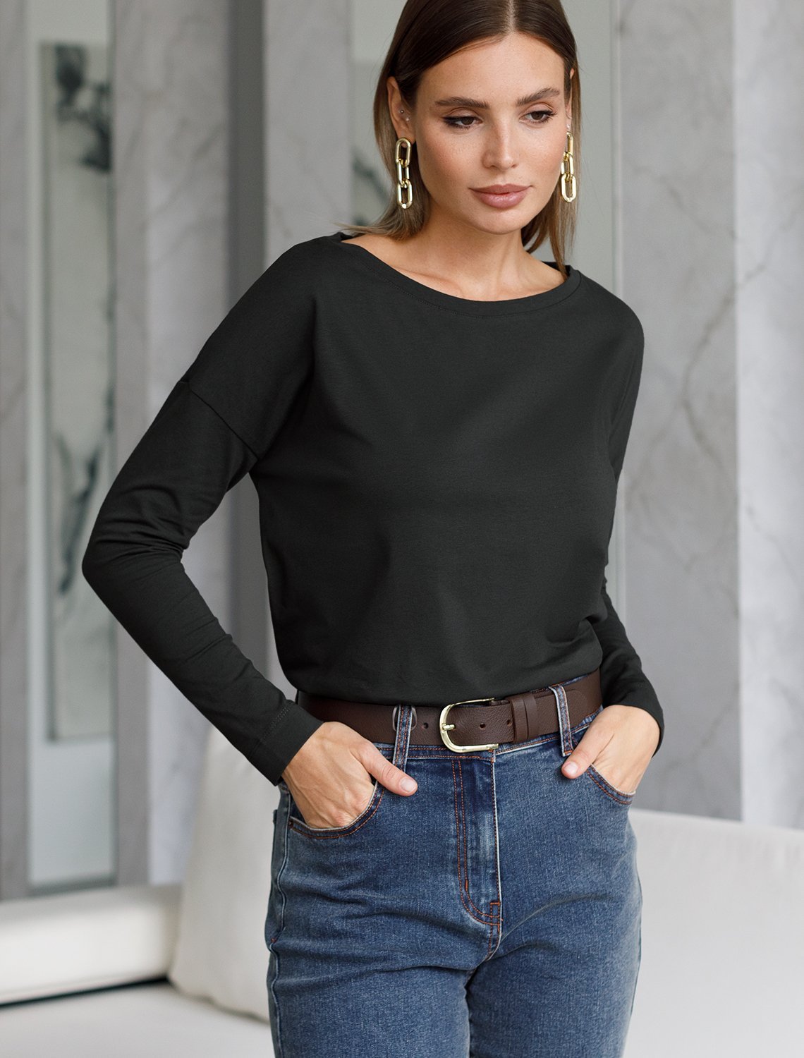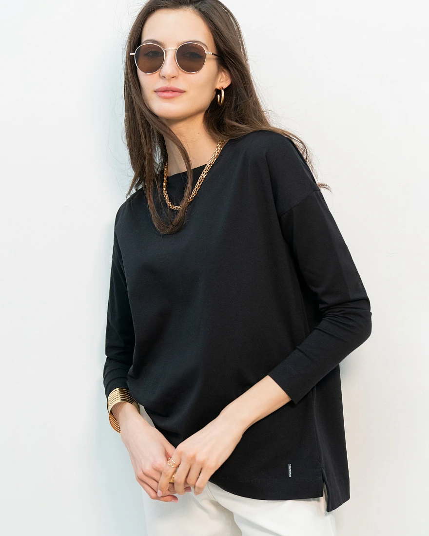 Свободный базовый джемпер черного цвета с длинными рукавами и круглым вырезом сшит из премиального хлопка. Однотонная хлопковая модель хорошо поддерживает комфортный для тела микроклимат. Благодаря вплетению эластановых волокон вещь хорошо сохраняет форму. Подходит для любого типа фигуры. черный