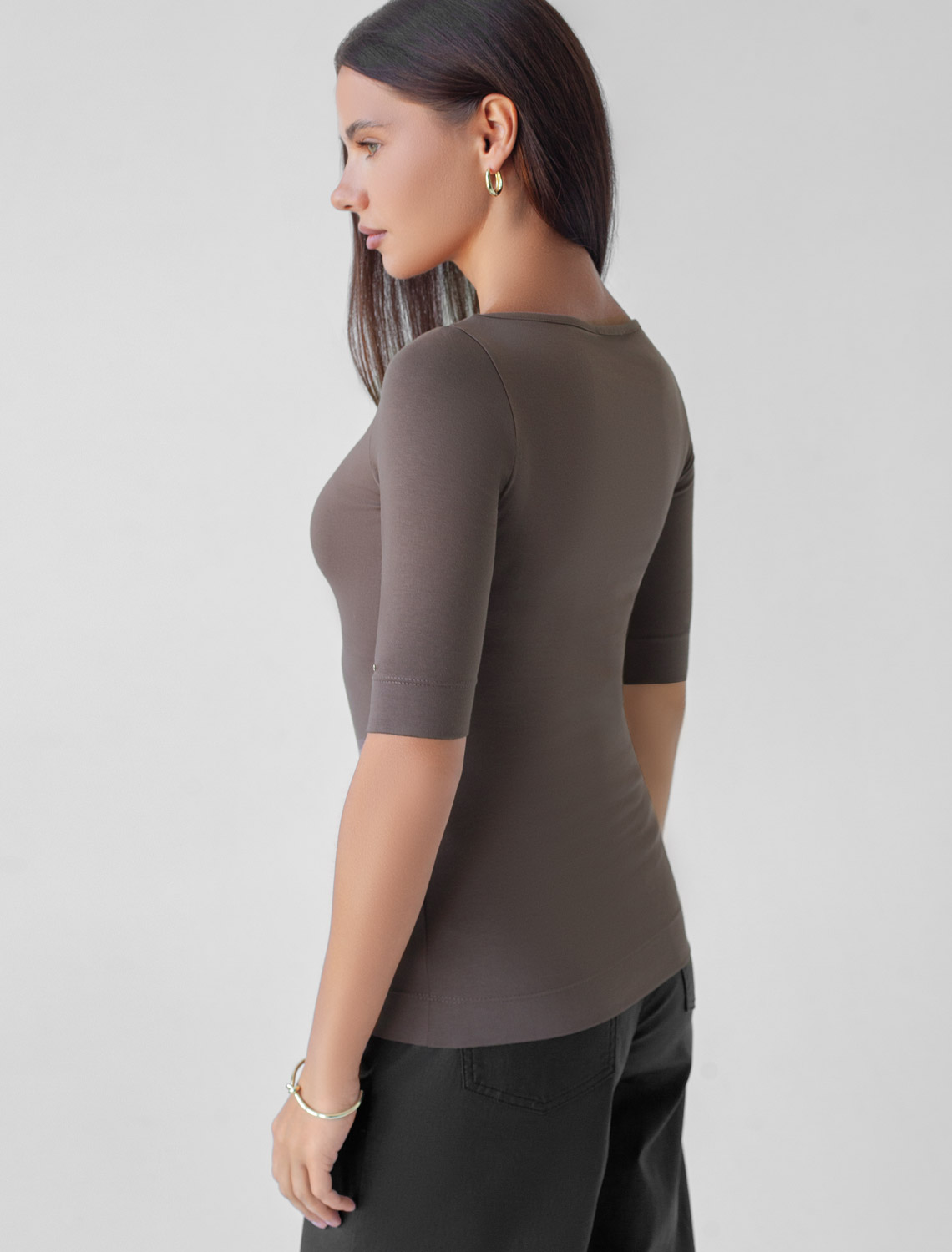 Футболка выполнена из премиального хлопка с добавлением эластана.Гладкий трикотаж обеспечит гарантированный комфорт и удобство в использовании. На рукаве металлическая нашивка с логотипом бренда. Издели будет хорошо сочетаться с любыми низами, жилетками и кардиганами, став выгодной инвестицией в базовый гардероб. темный кофе