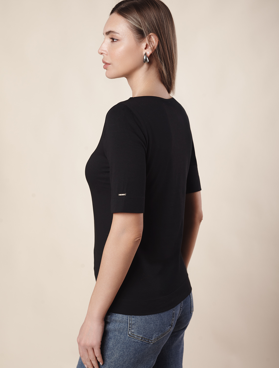 Футболка выполнена из премиального хлопка с добавлением эластана.Гладкий трикотаж обеспечит гарантированный комфорт и удобство в использовании. На рукаве металлическая нашивка с логотипом бренда. Издели будет хорошо сочетаться с любыми низами, жилетками и кардиганами, став выгодной инвестицией в базовый гардероб. черный