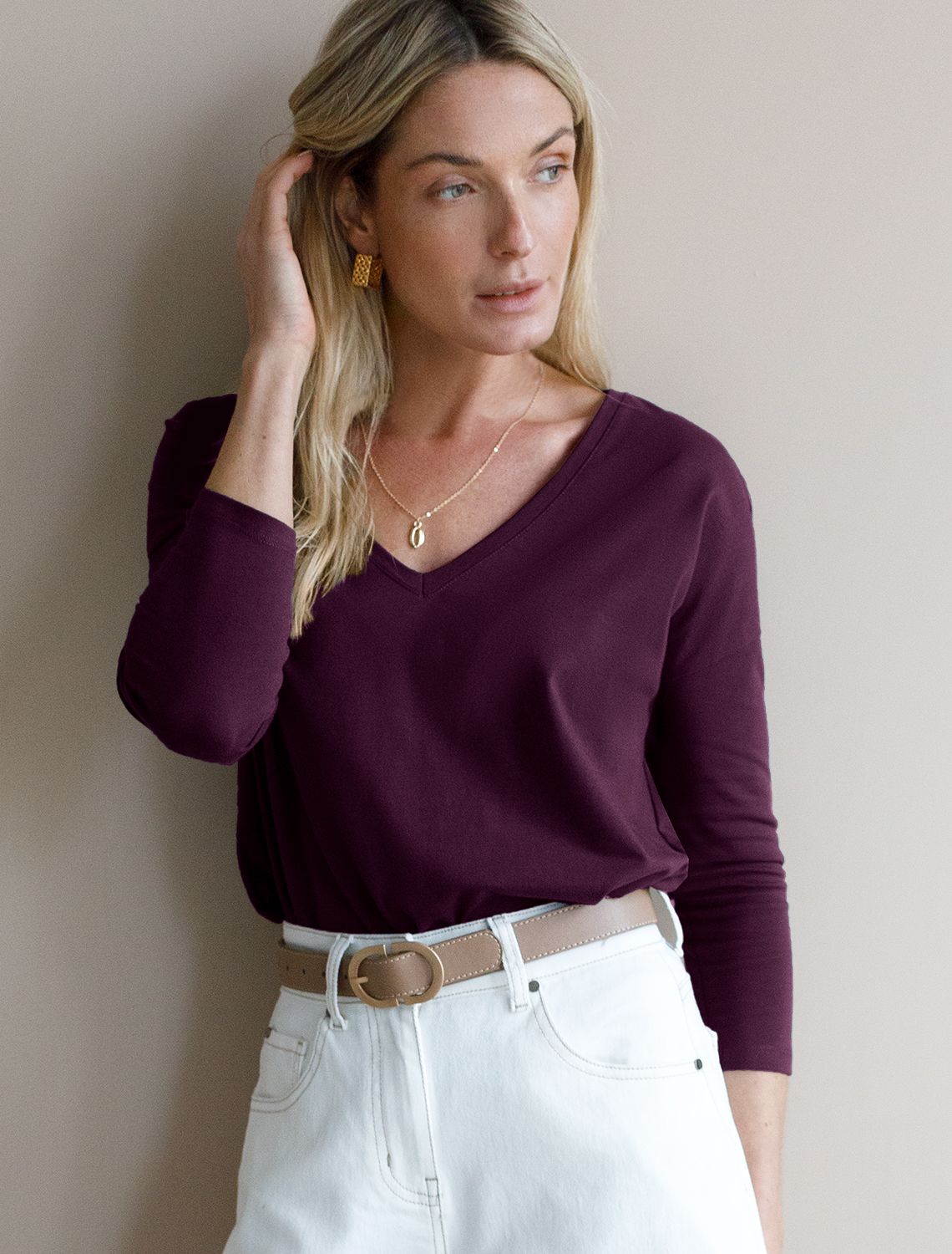 Рост 172, бюст 88, талия 64, бедра 88 Джемпер с длинными рукавами и глубоким V-образным вырезом сшит из премиального хлопка. Однотонная хлопковая модель свободного кроя хорошо поддерживает комфортный для тела микроклимат. Благодаря вплетению эластановых волокон вещь хорошо сохраняет форму.