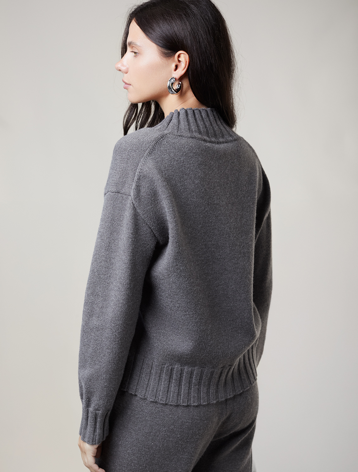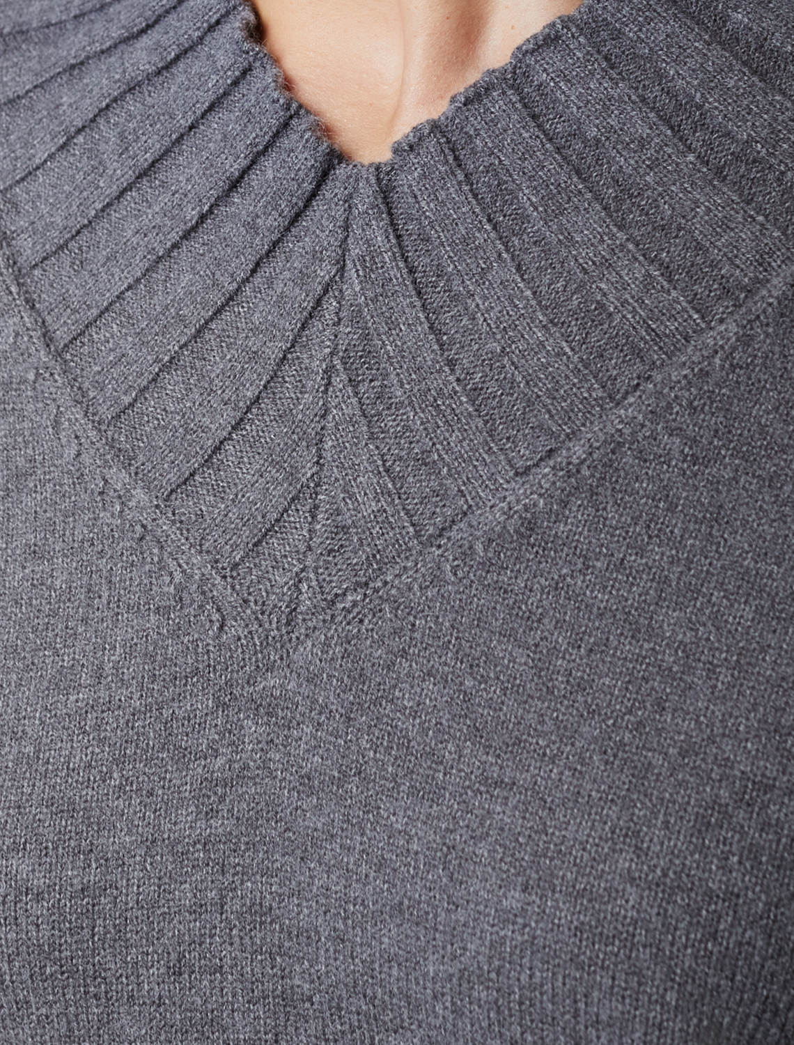 Джемпер выполнен из мягкой пряжи с кашемиром. Изделие дополнено высоким V-вырезом с широкой рибаной. Мягкая пряжа очень приятная к телу, поддержит комфорт на протяжении всего дня, при этом не перегревая. Сочетается в костюме с брюками D38.013, D38.012 и юбкой D36.016 темно-серый меланж