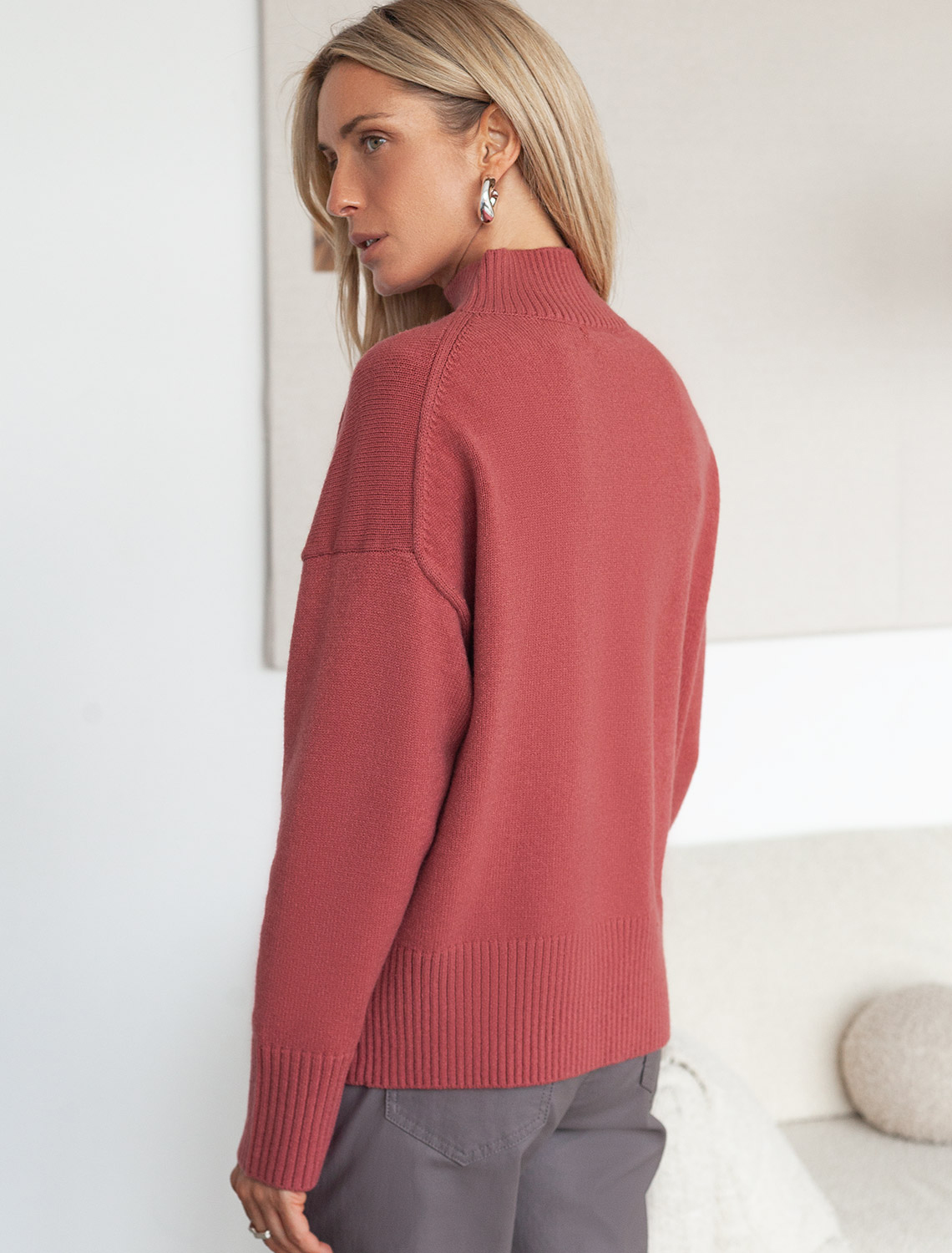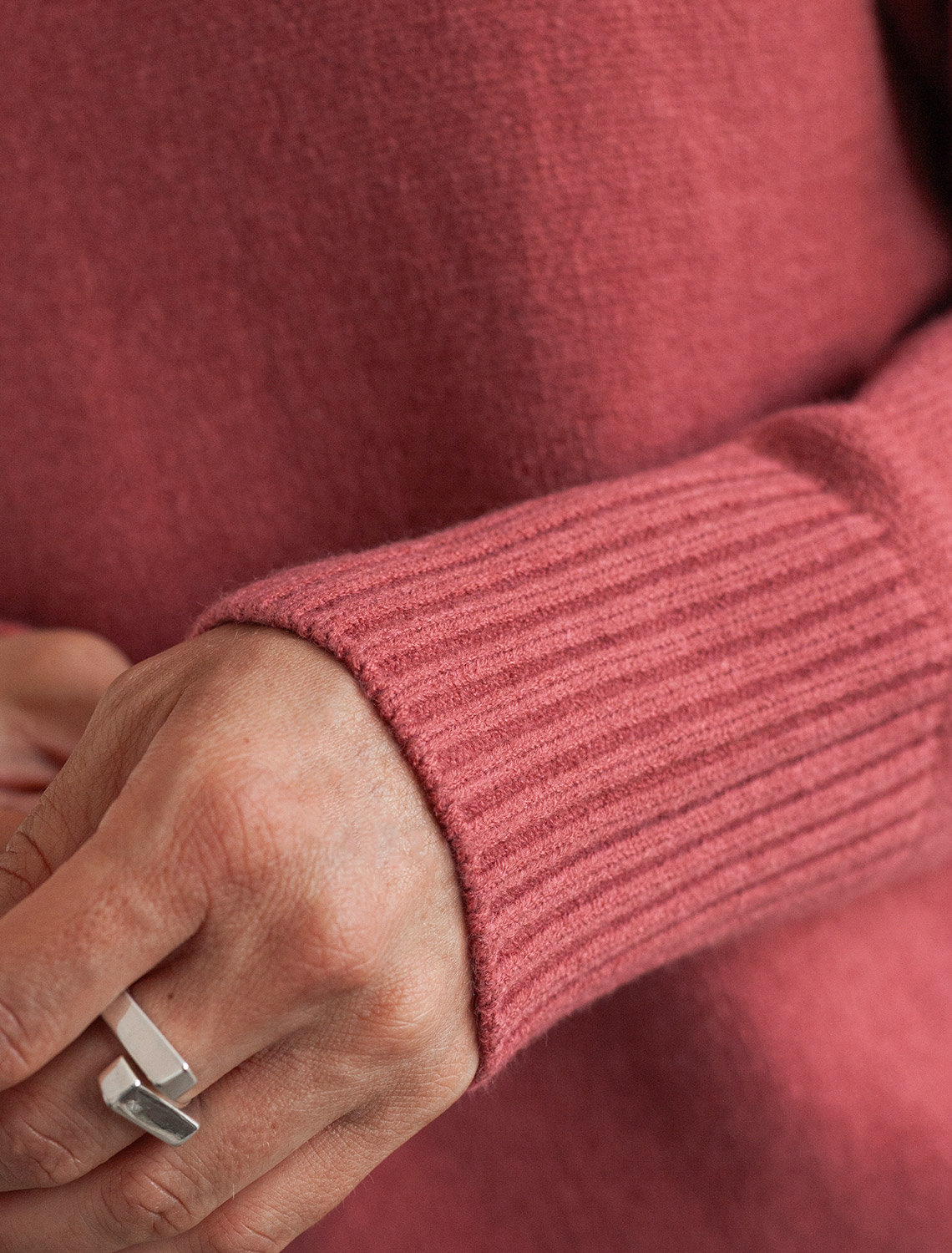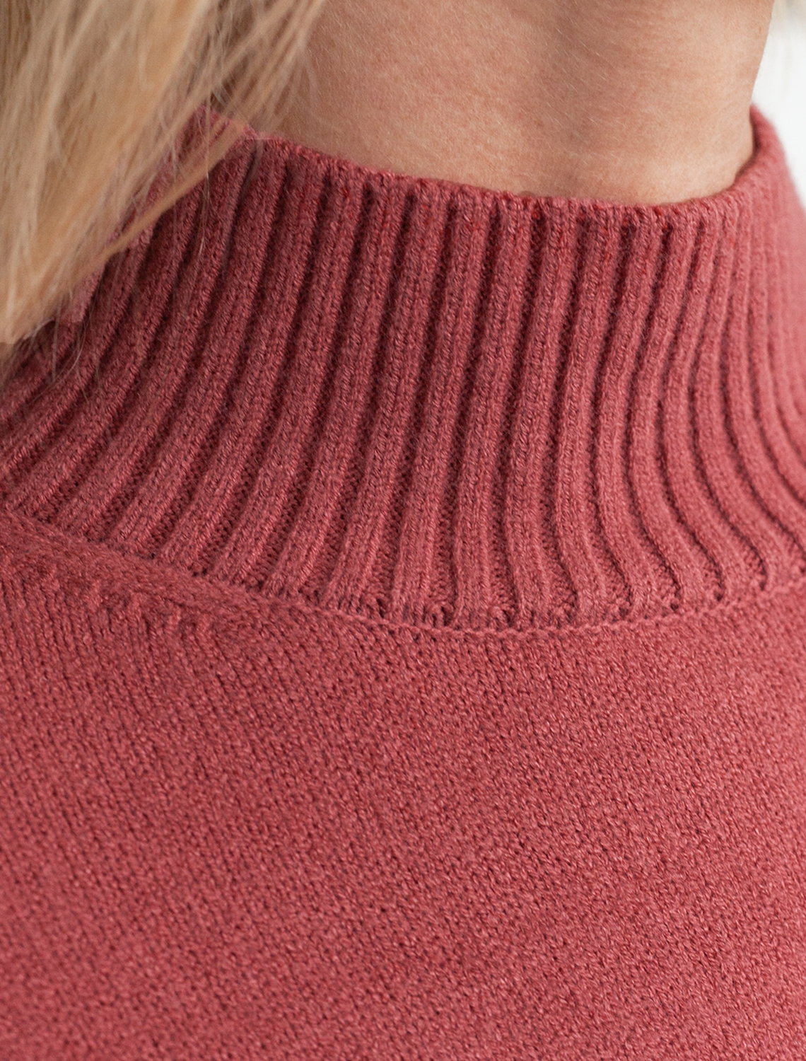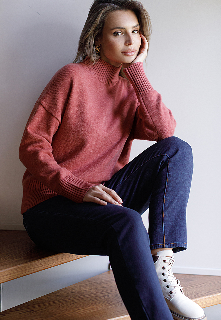Свитер темно-кораллового цвета с высоким воротом связан из высококачественной пряжи с кашемиром — идеальное сочетание мягкости и практичности. Пряжа с кашемиром придаёт ему бархатистую нежность и тонкую структуру, каждое прикосновение с которой, напоминает о тепле и уюте в прохладные дни. Благодаря нежной текстуре материала этот вариант отлично подходит даже для чувствительной кожи, не вызывая раздражения и дискомфорта в течение дня. Спущенная иния плеча придает свитеру расслабленный вид, подчеркивая актуальный стильный образ обладательницы. Универсальный крой и длина подходит для разных типов фигуры, в том числе и на большие размеры, свободный фасон не стесняет движений, а оверсайз силуэт актуален в этом сезоне и выглядит современно. Длинный рукав с широкими манжетами защищает от холода, делая этот вариант особенно практичным в осенне-зимний период. Такой теплый свитер станет надежным спутником в межсезонье и зимние дни, сочетая практичность, комфорт и стиль. Сочетается в костюме с брюками D38.013, D38.012 и юбкой D36.016 темно-коралловый