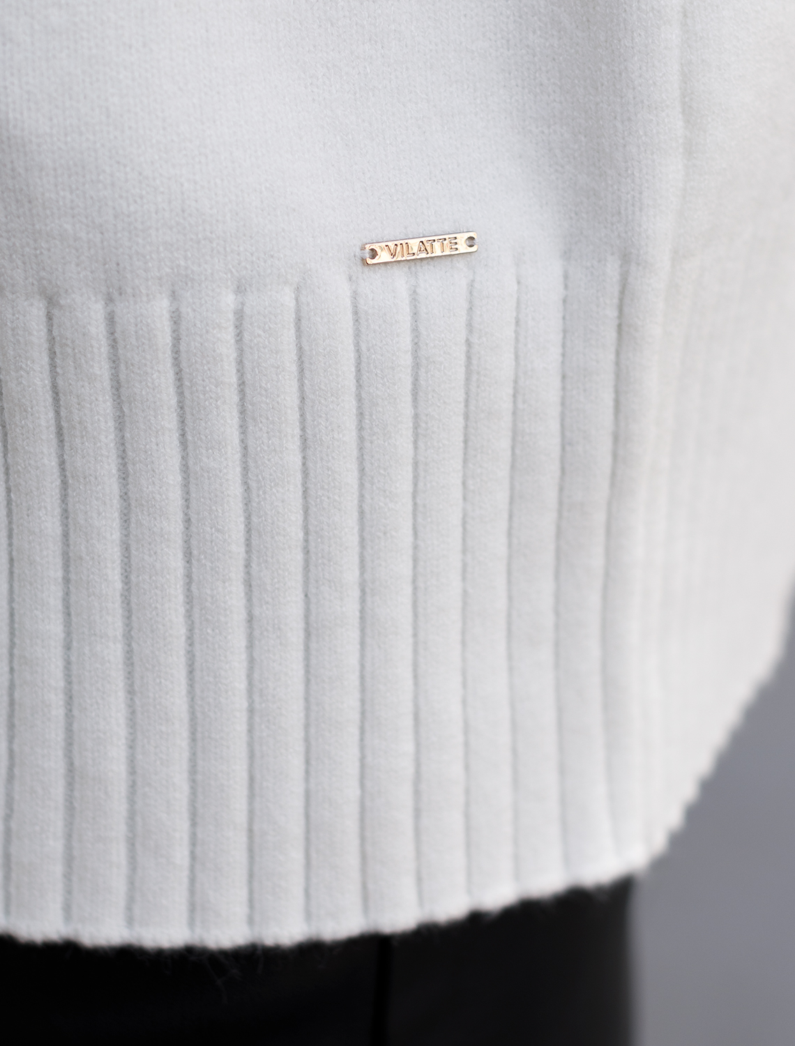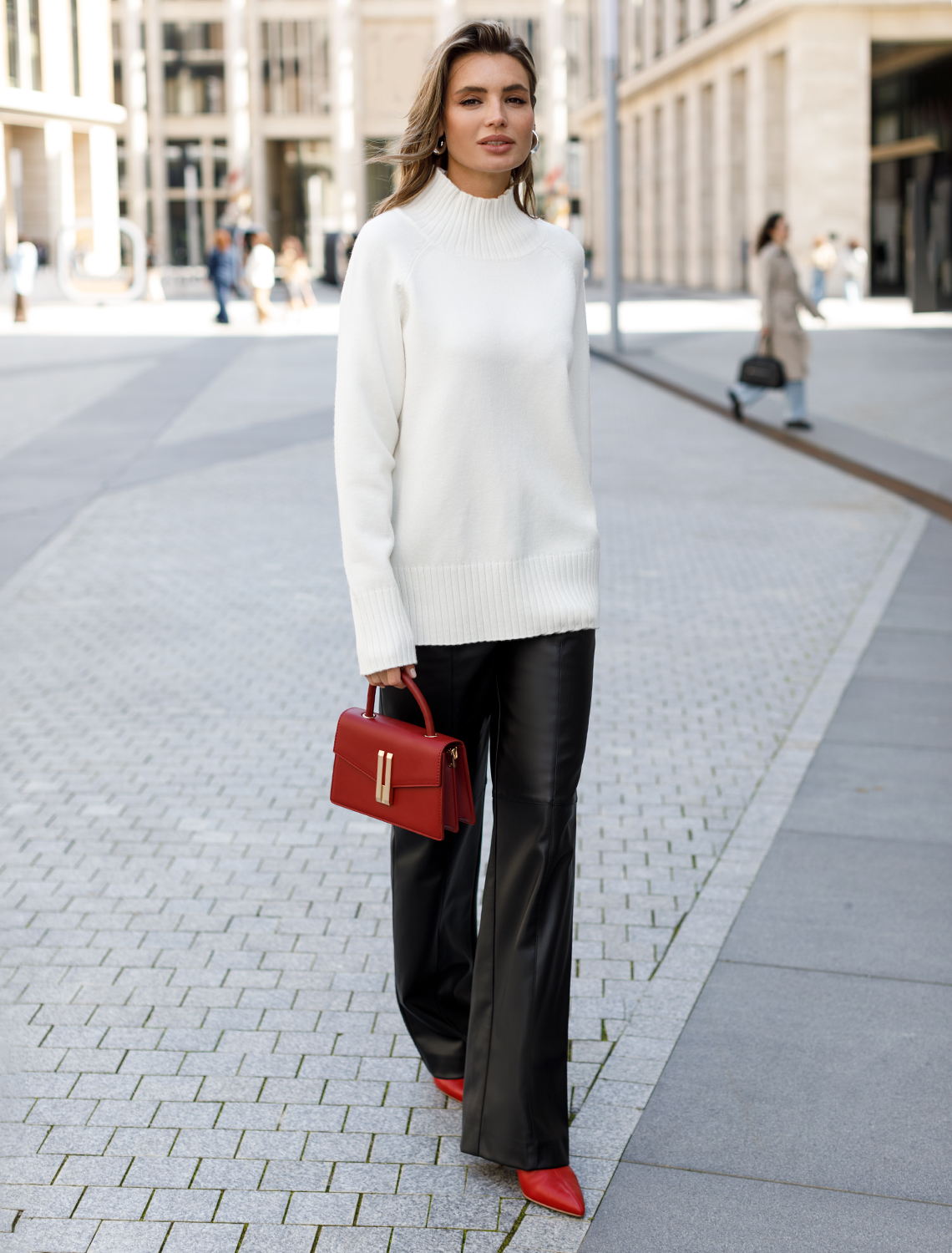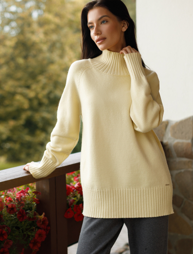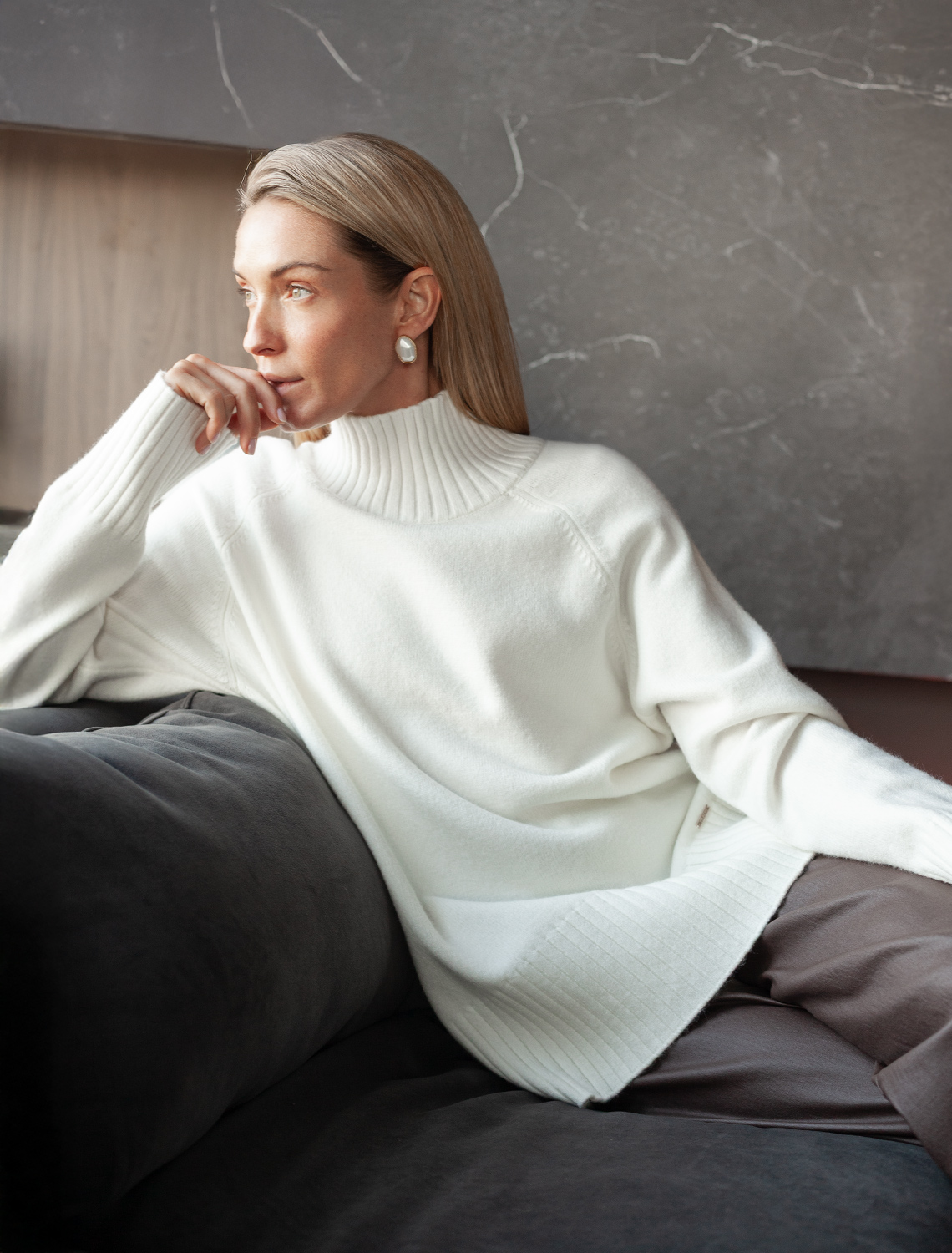 Джемпер с воротом стойка выполнен из мягкой пряжи с кашемиром. Модель свободного силуэта с рукавом реглан будет стильно сочетается с брюками и джинсами. Мягкая пряжа очень приятная к телу, поддержит комфорт на протяжении всего дня, при этом не перегревая. Сочетается в костюме с брюками D38.013, D38.012 и юбкой D36.016 натуральный белый