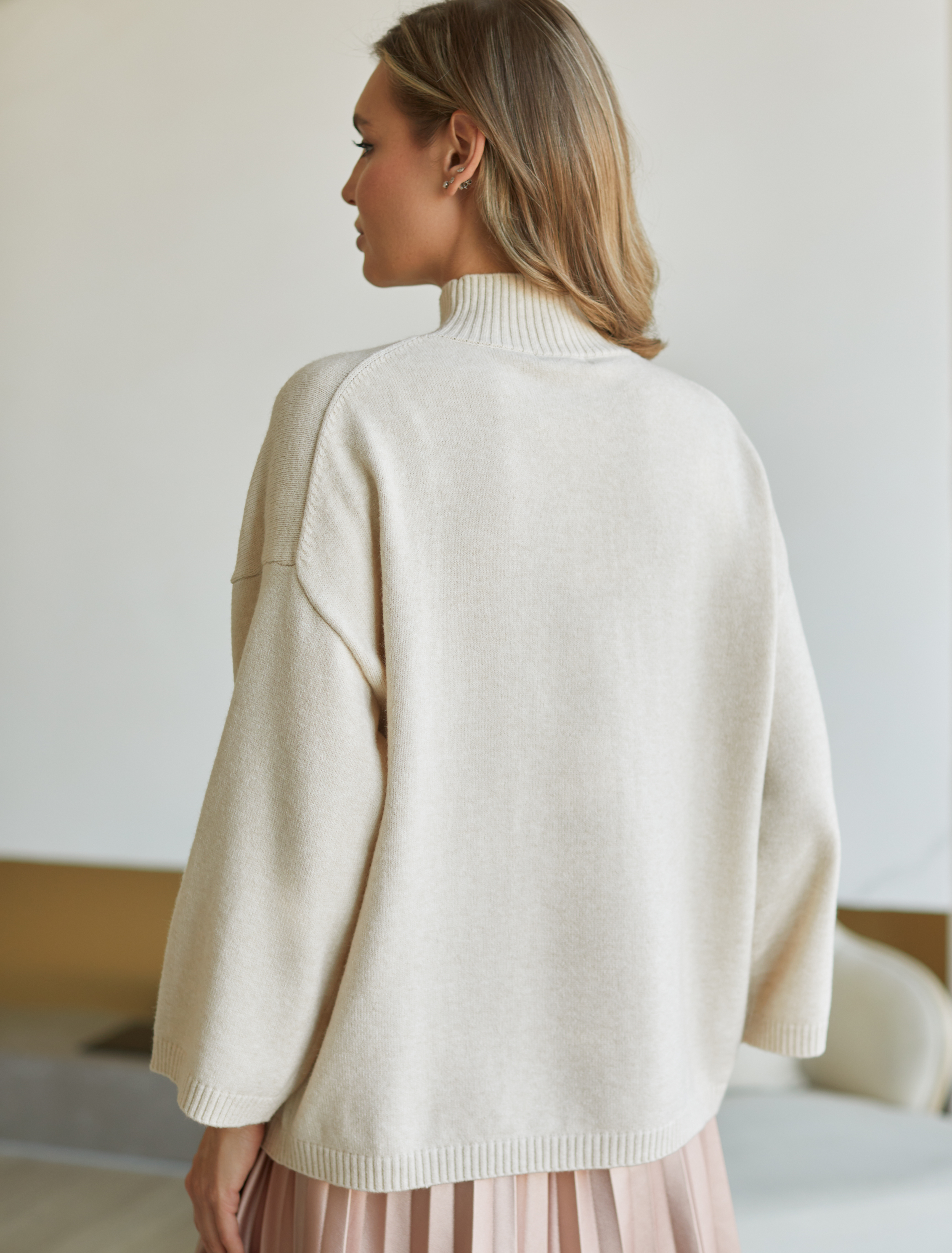 Джемпер выполнен из мягкой пряжи с кашемиром. Фишкой изделия являются свободные рукава на одном уровне с низом, это выгодно подчёркивает силуэт визуально вытягивая его. Мягкая пряжа очень приятная к телу, поддержит комфорт на протяжении всего дня, при этом не перегревая. Сочетается в костюме с брюками D38.013, D38.012 и юбкой D36.016 овсяный меланж