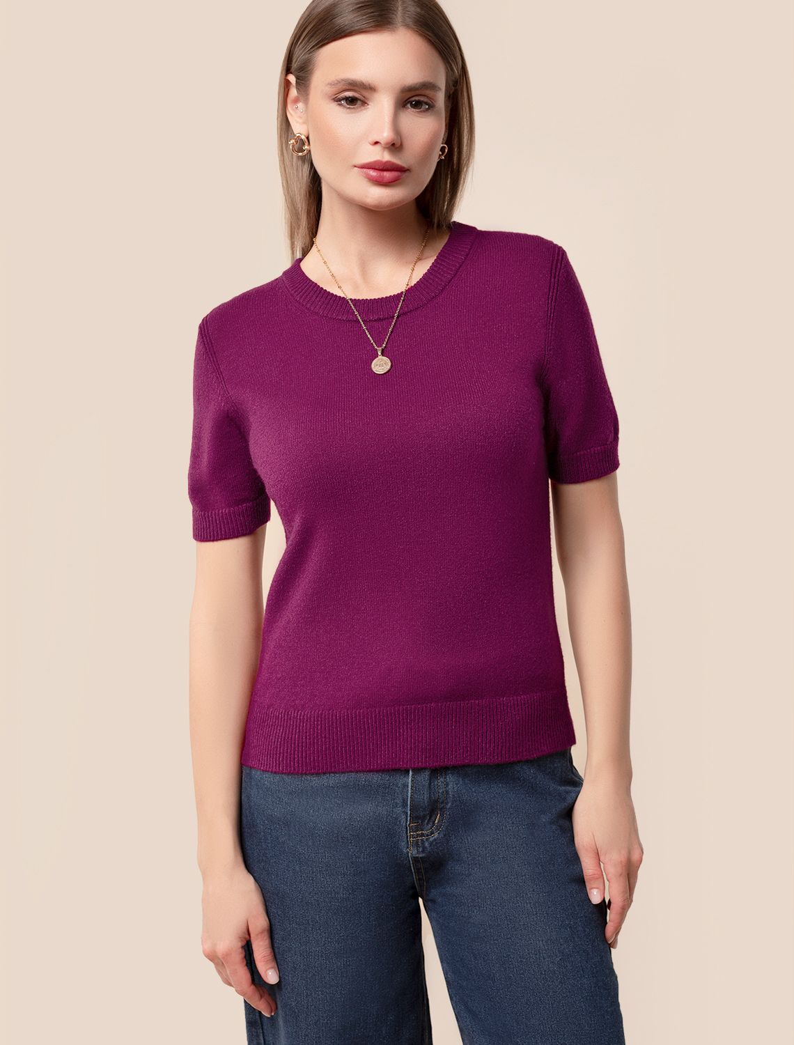 Джемпер выполнен из мягкой пряжи с кашемиром. Модель с короткими рукавами подойдет даже для офисного дресс-кода. Нежная пряжа приятно ощущается на теле, сохраняя комфортное тепло. Не колется и не перегревает. Изделие дополнено металлическим логотипом бренда. пурпурный