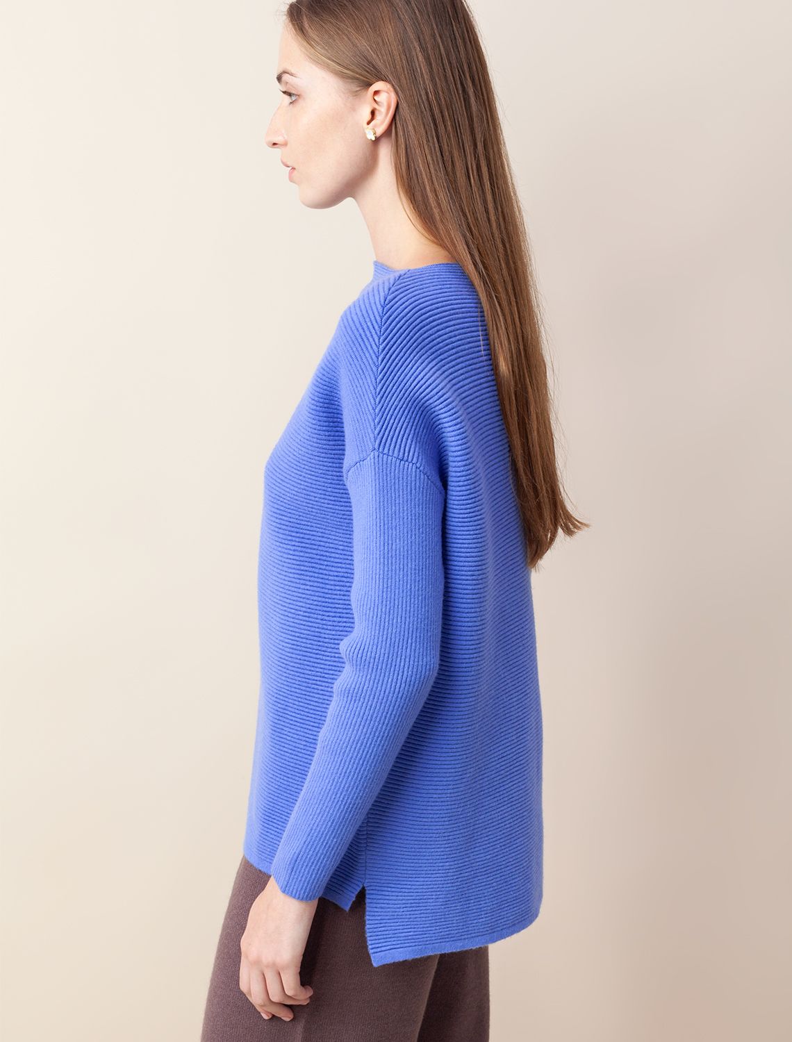 Джемпер со спущенной линией плеч и горловиной формы «лодочка» выполнен из пряжи с кашемиром. Мягкое, но при этом достаточно плотное плетение -фактурная вязка в рубчик, позволяет изделию сохранять форму и тепло. Свободный силуэт походит для любой фигуры. В комплекте с брюками D38.008 или D38.009 можно собрать уютный костюм или носить джемпер отдельно, с денимом и эко-кожей. светло-синий