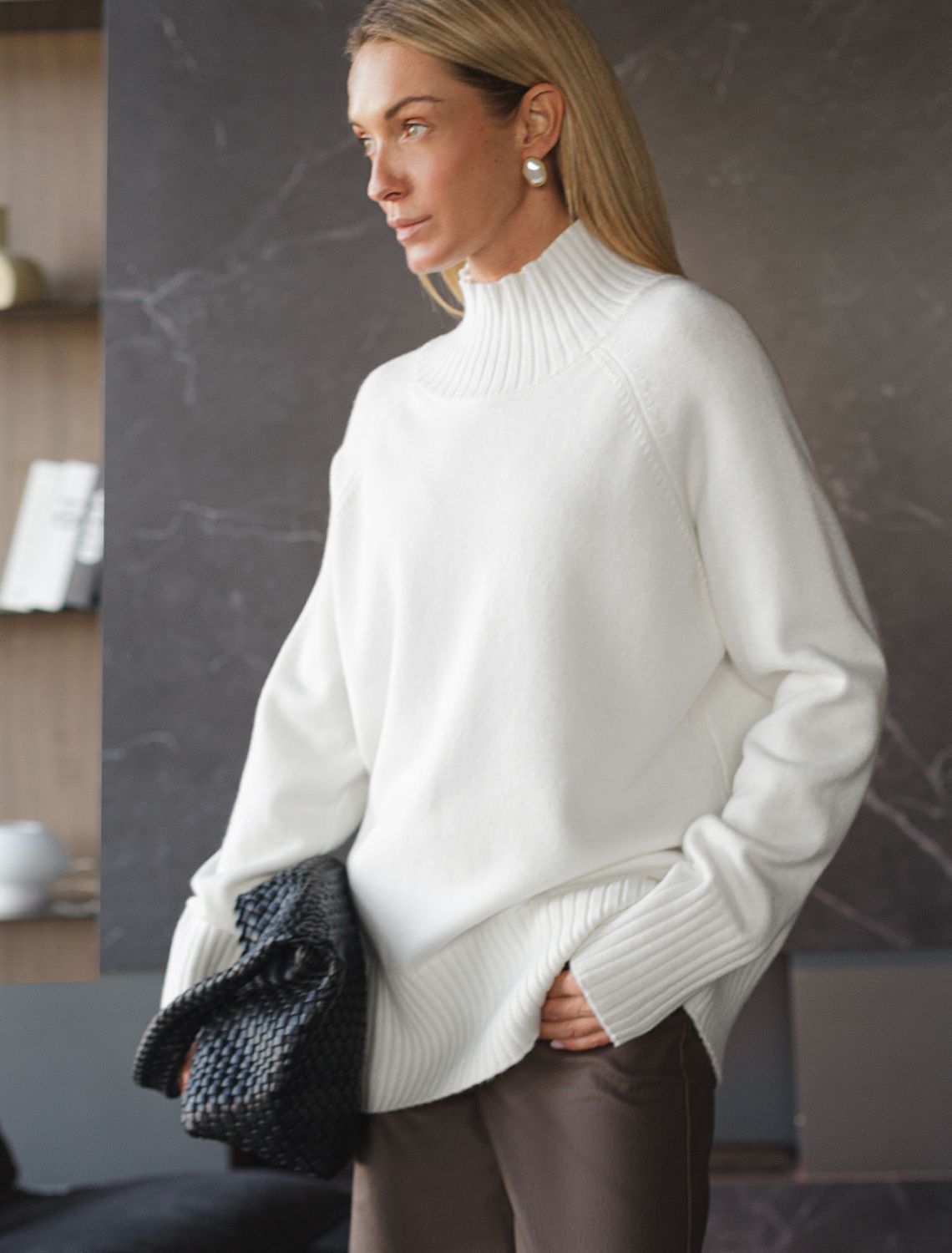 Джемпер с воротом стойка выполнен из мягкой пряжи с кашемиром. Модель свободного силуэта с рукавом реглан будет стильно сочетается с брюками и джинсами. Мягкая пряжа очень приятная к телу, поддержит комфорт на протяжении всего дня, при этом не перегревая. Сочетается в костюме с брюками D38.013, D38.012 и юбкой D36.016