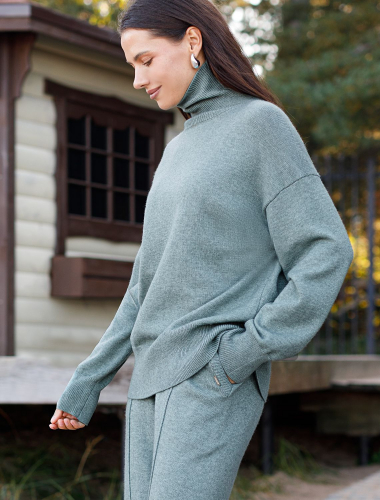 Джемпер выполнен из мягкой пряжи с кашемиром. Изделие дополнено высоким V-вырезом с широкой рибаной. Мягкая пряжа очень приятная к телу, поддержит комфорт на протяжении всего дня, при этом не перегревая. Сочетается в костюме с брюками D38.013, D38.012 и юбкой D36.016