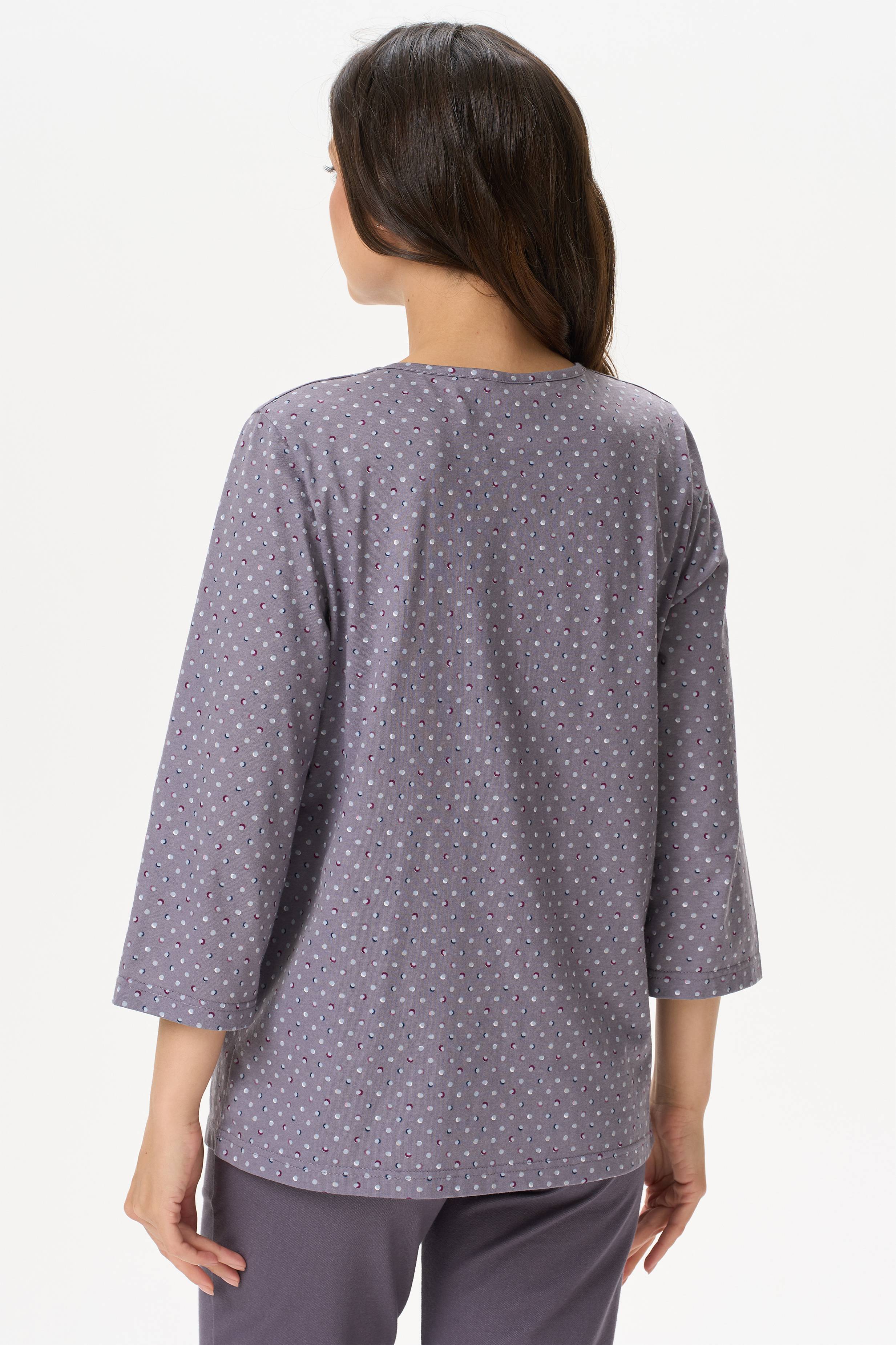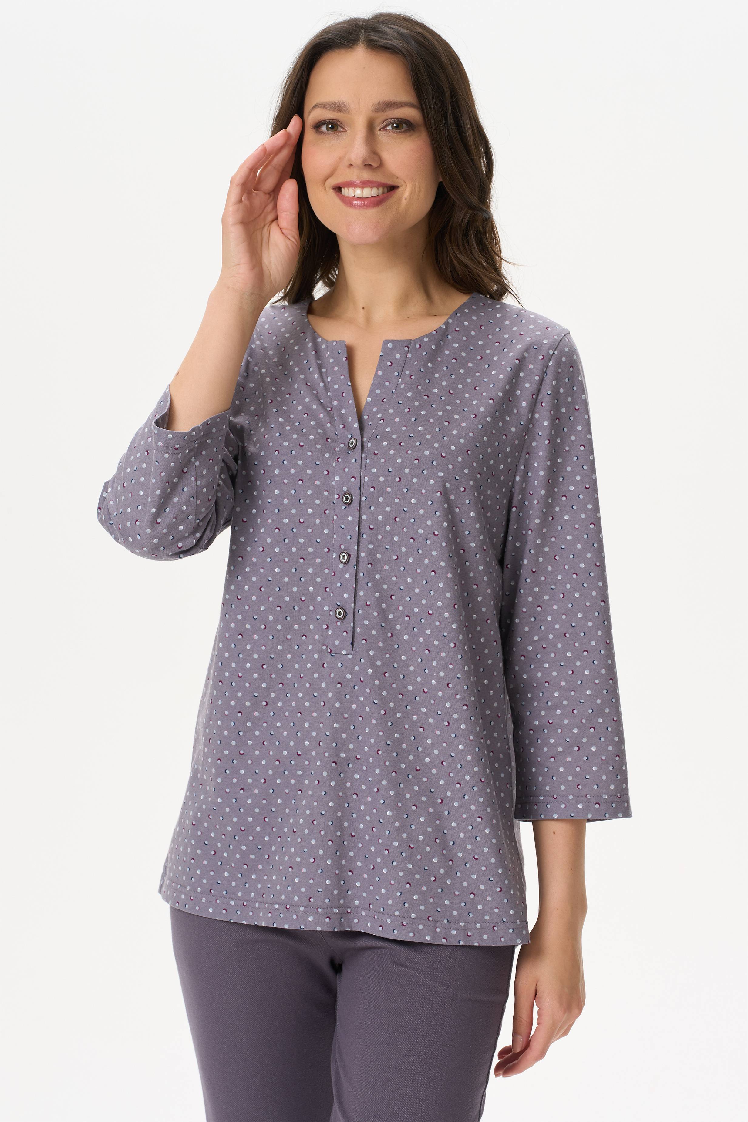 Блузка прямого силуэта из хлопкового трикотажного полотна. Круглый вырез горловины с планкой-застежкой на четыре пуговицы. Рукава длинной 3/4. Рост модели на фото 170см.