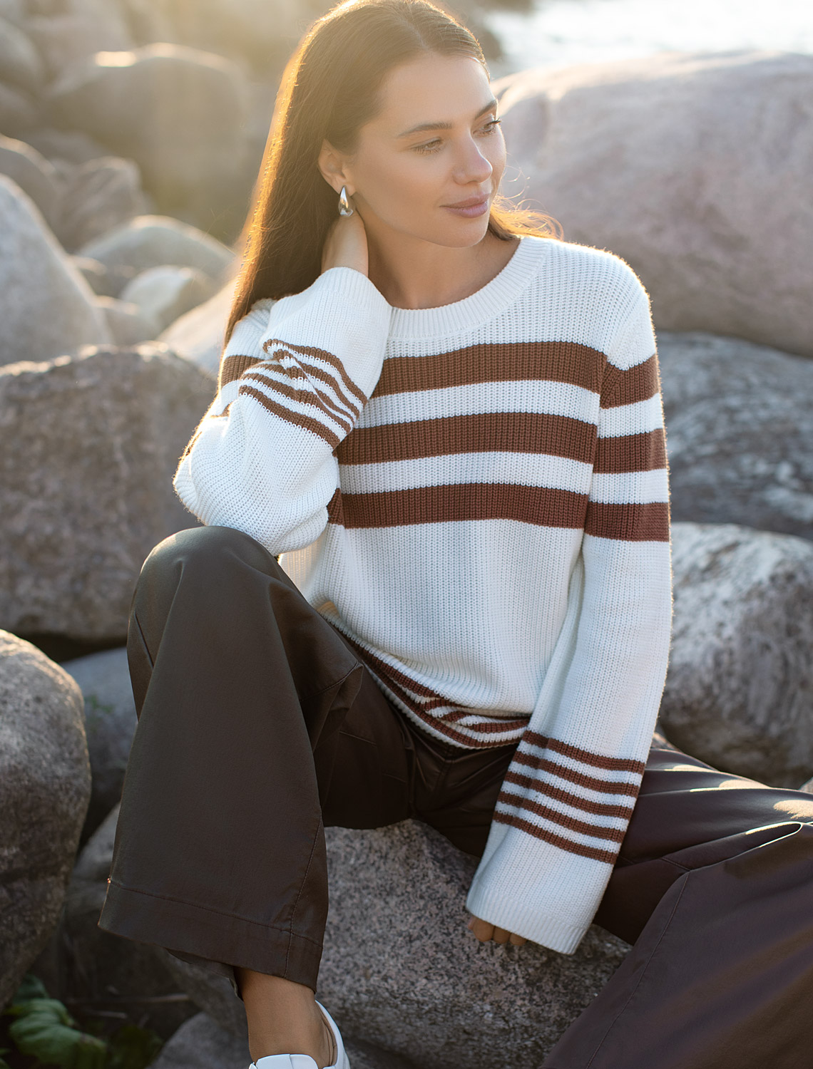Джемпер крупной вязки выполнен из хлопковой пряжи. Полосатый узор и эффектно сочетающиеся цвета сделают любой образ роскошным и расслабленным. Благодаря натуральному составу и воздушной фактуре в изделии будет комфортно в любое время года. Свободный силуэт подходит для любой фигуры. белый_кофейный