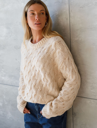 Джемпер в овсяном оттенке выполнен из уютной пряжи крупной вязки с ангорой и легким пушистым мохером. Модель с фактурным узором косы очень приятная на ощупь, в которую хочется укутаться. Отлично согревает, а свободный силуэт позволяет носить изделие на футболку или рубашку. Из украшений металлический логотип бренда.