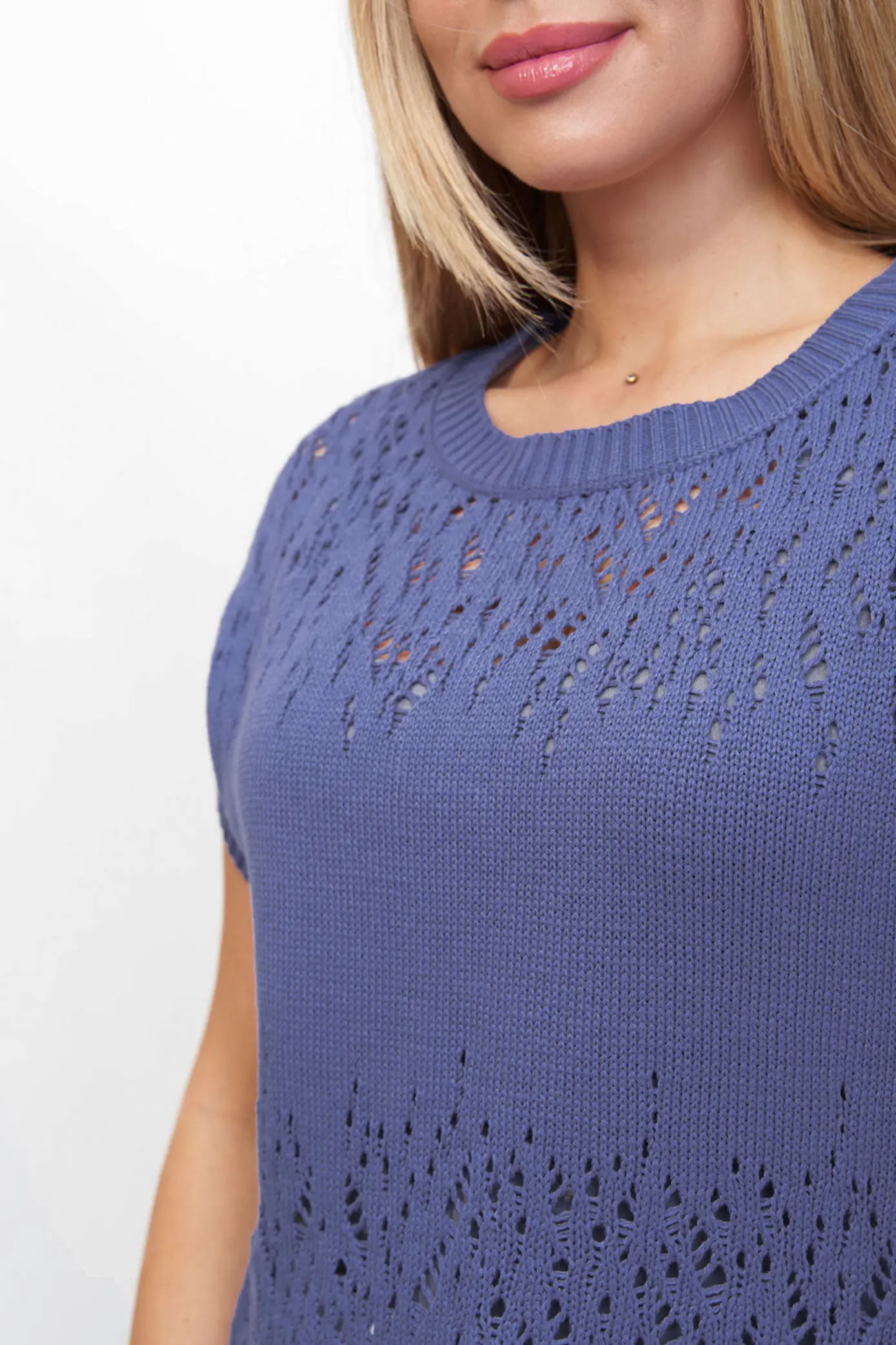 Женский ажурный трикотажный джемпер со спущенным плечом, вырез горловины круглый. Джемпер выполнен ажурным переплетением, низ изделия, вырез горловины и пройймы рукавов выполнены эластичным переплетением. джинс