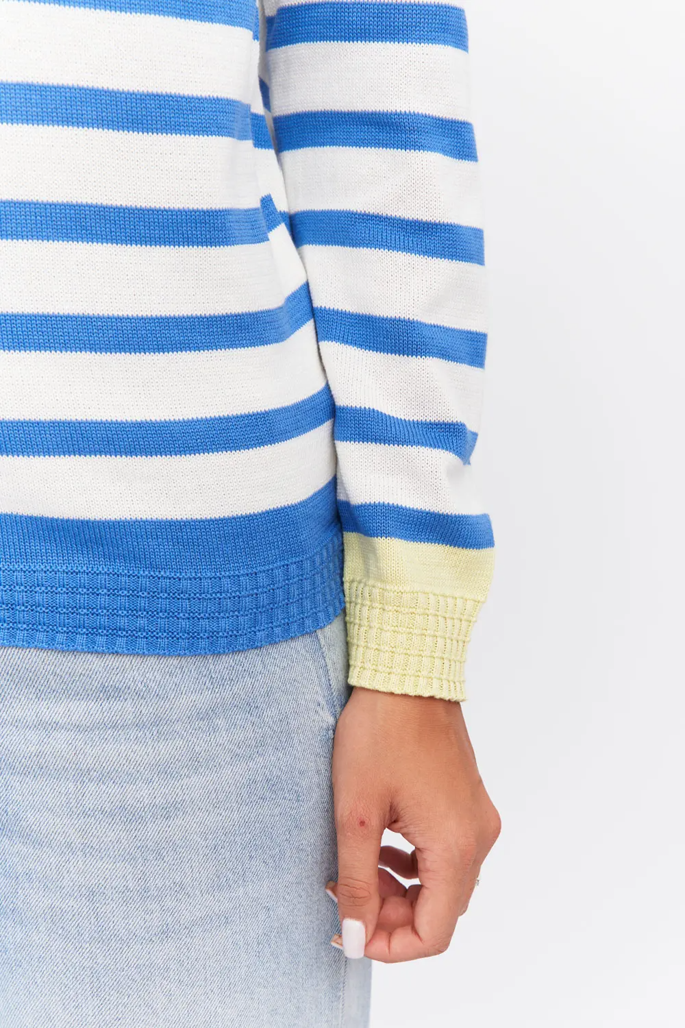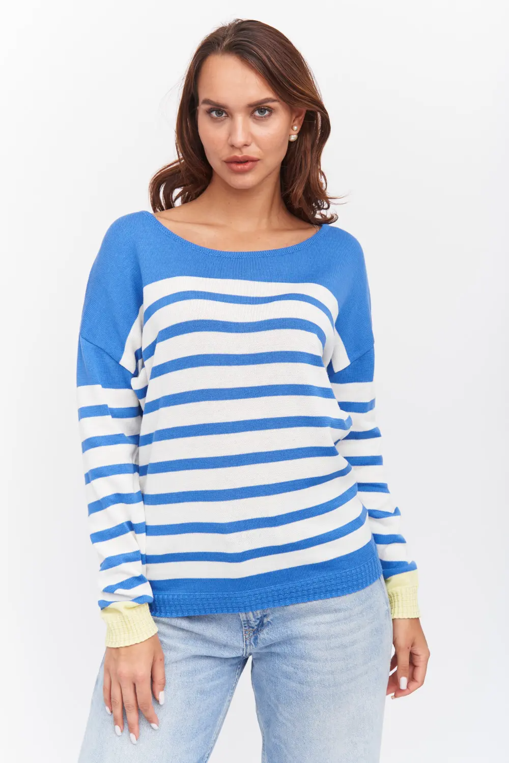 Джемпер женский трикотажный свободного силуэта, плечо спущенное, рукава втачные длинные. Вырез горловины круглый.  Джемпер выполнен гладким переплетением, сочетание горизонтальных полос контрастного цвета. Манжеты и низ изделия рельефным переплетением. синий