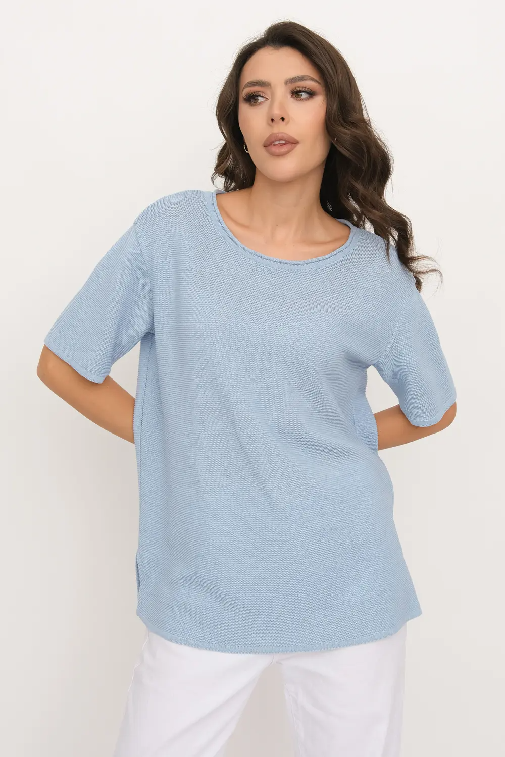 Женский трикотажный джемпер свободного силуэта. Рукав втачной короткий, вырез горловины круглый. Джемпер выполнен  структурным кулирным переплетением. голубой