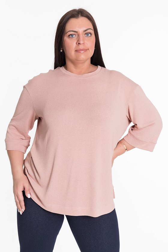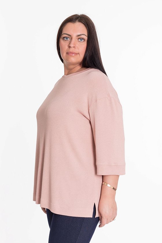 Однотонный джемпер из вязаного трикотажа с выточками по бокам и спущенным рукавом — удобная и стильная вещь для повседневного гардероба. Длина рукава 3/4 обеспечивает комфорт, а свободный крой не сковывает движений. Горловина и нижние срезы рукавов обработаны притачными планками, что придаёт изделию аккуратный вид.
